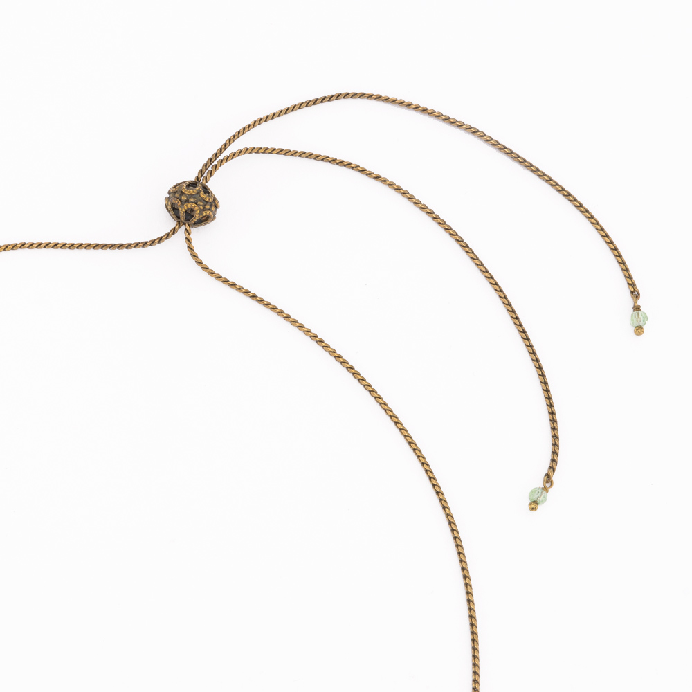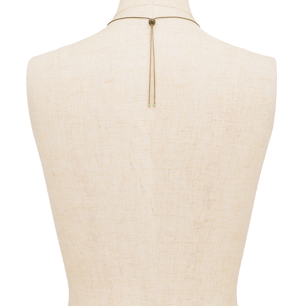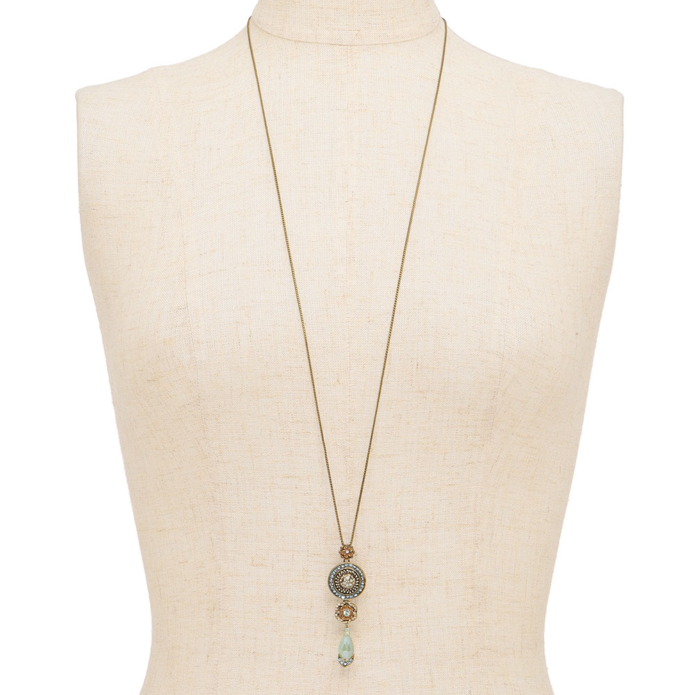 パーツを縦につなげたロングペンダント。スライド式で簡単に長さ調節ができます。ネックレス(商品番号:J01001)とセット使いも華やか。商品画像の説明