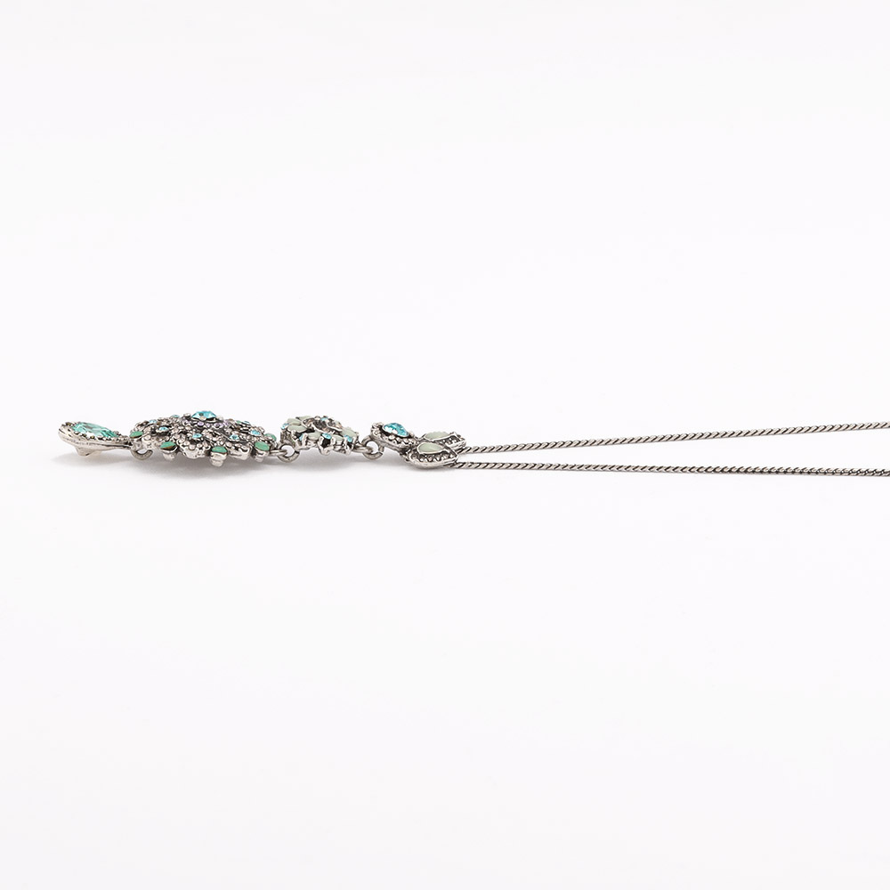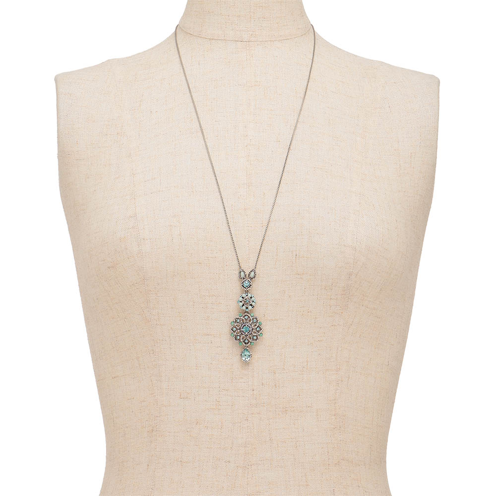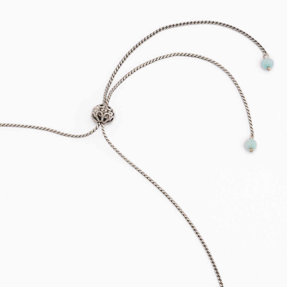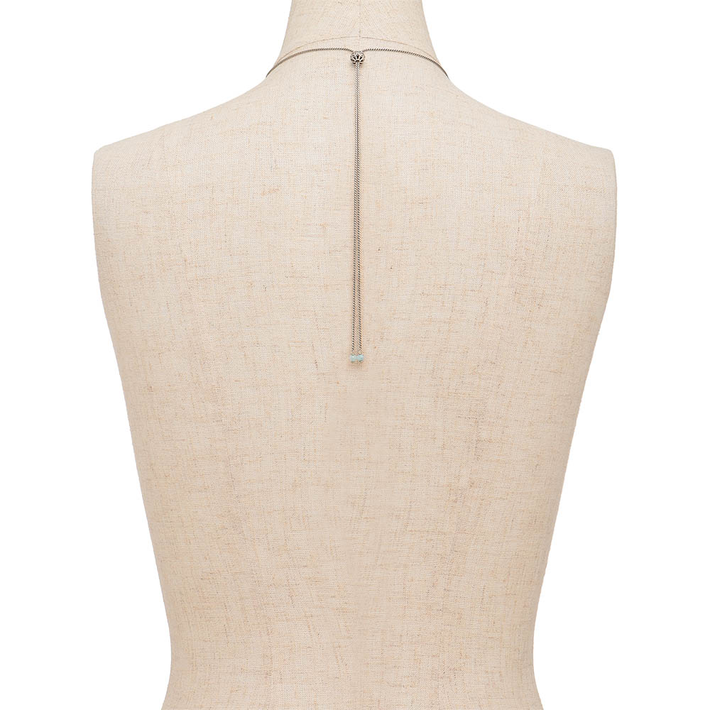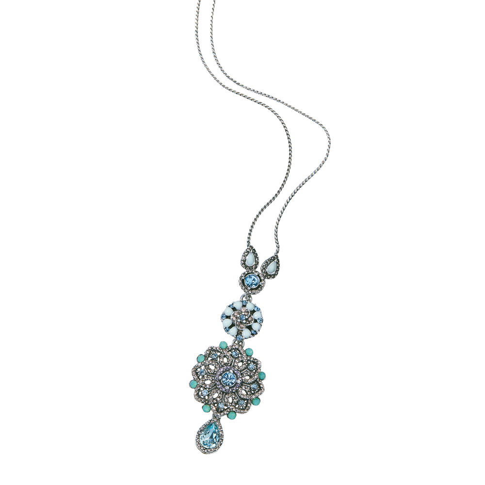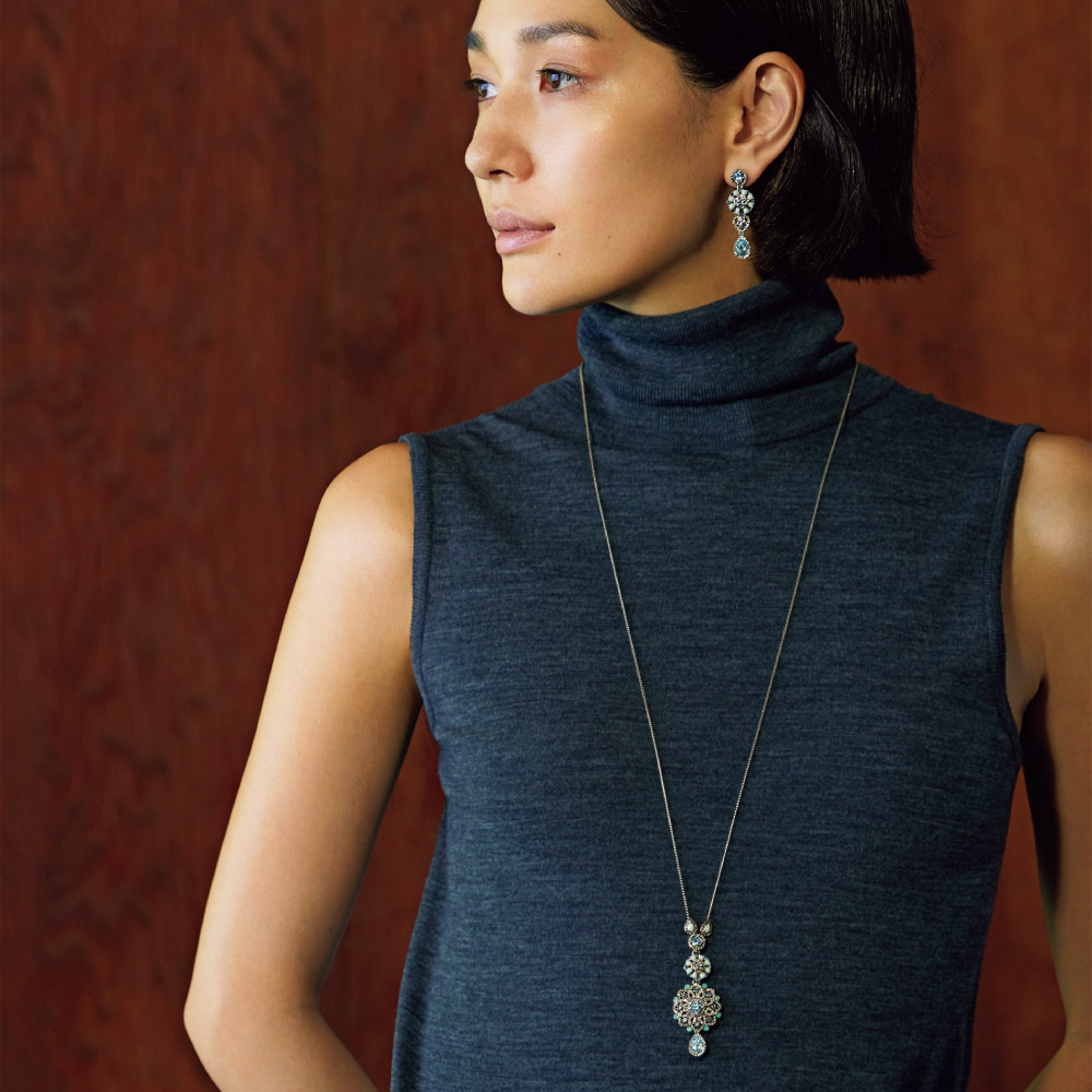 身のこなしと共に揺れるたびに香り立つ、ノスタルジックな甘さが印象的。ブルーのガラスとパステルブルーのエナメルで繊細に花モチーフを表現。スライド式で長さ調節ができるロングペンダント。