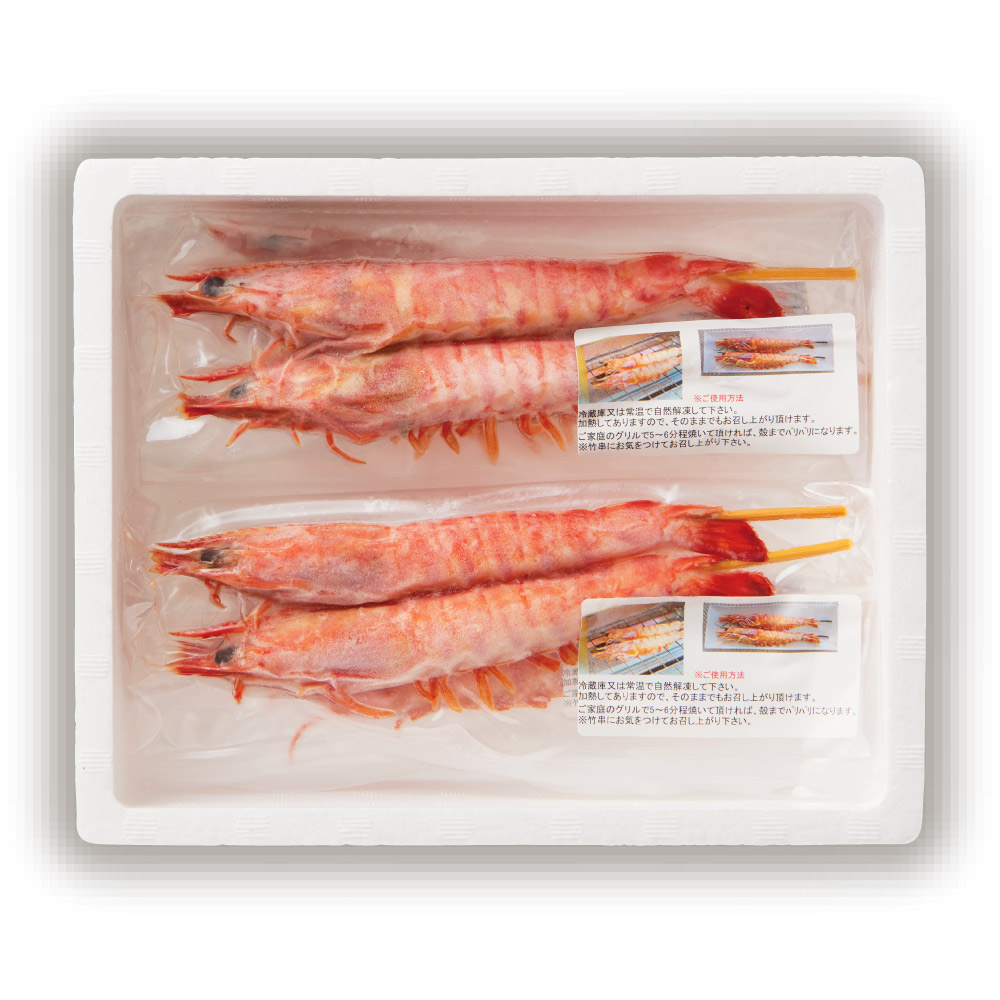 大車海老に串を打ち、釜炊きの天然塩をまぶしてお手元へ。下茹で済みだから、解凍後そのままでも、グリルやオーブントースターで焼くとさらにおいしく召し上がれます。香ばしい香りと甘い車エビの味が贅沢に手軽に味わえます。