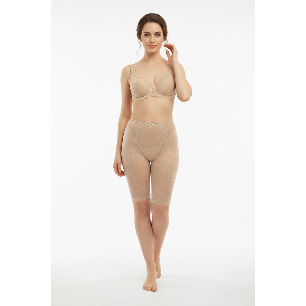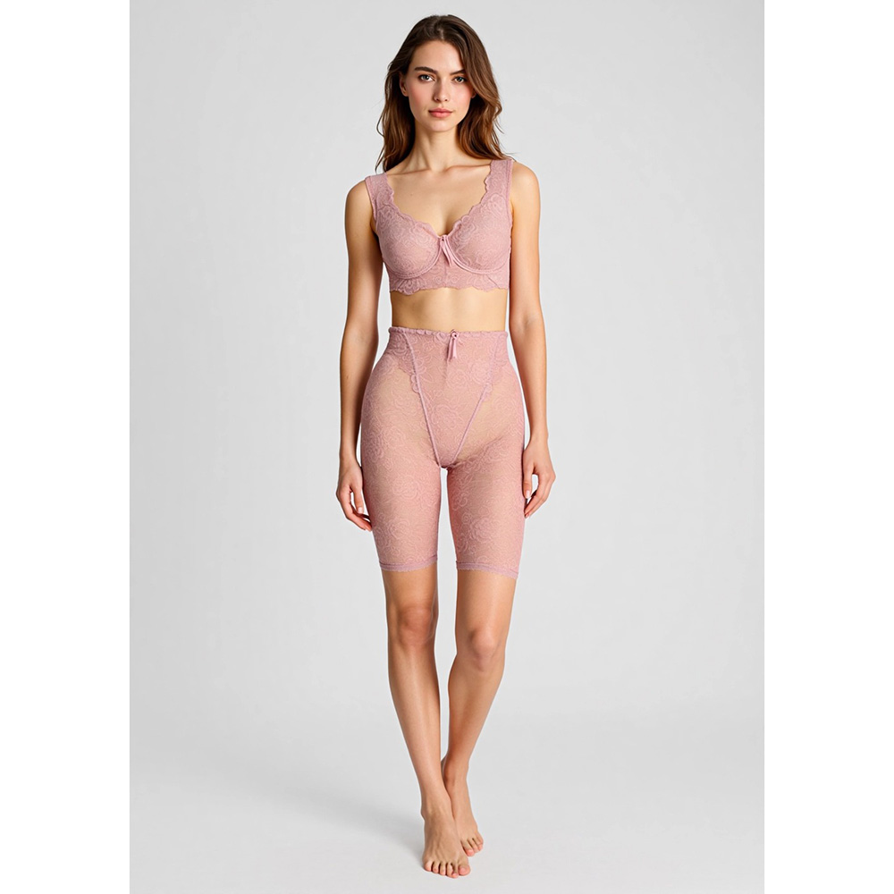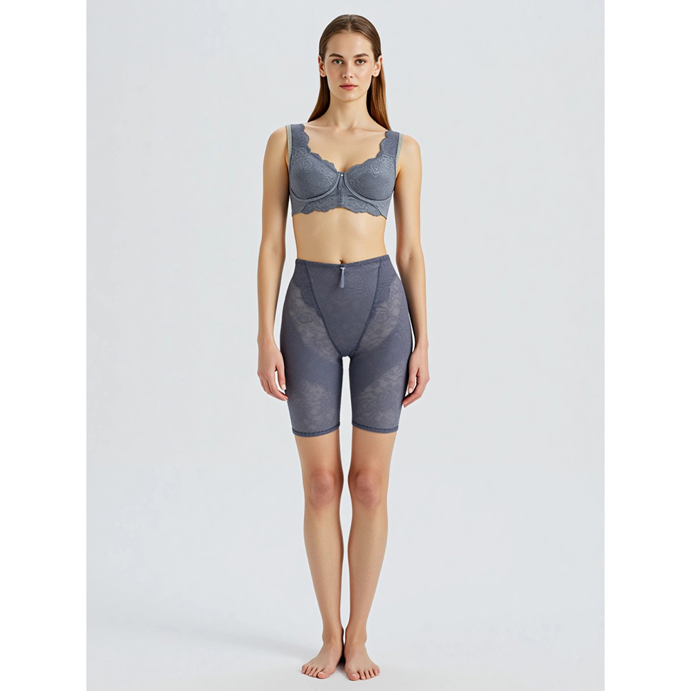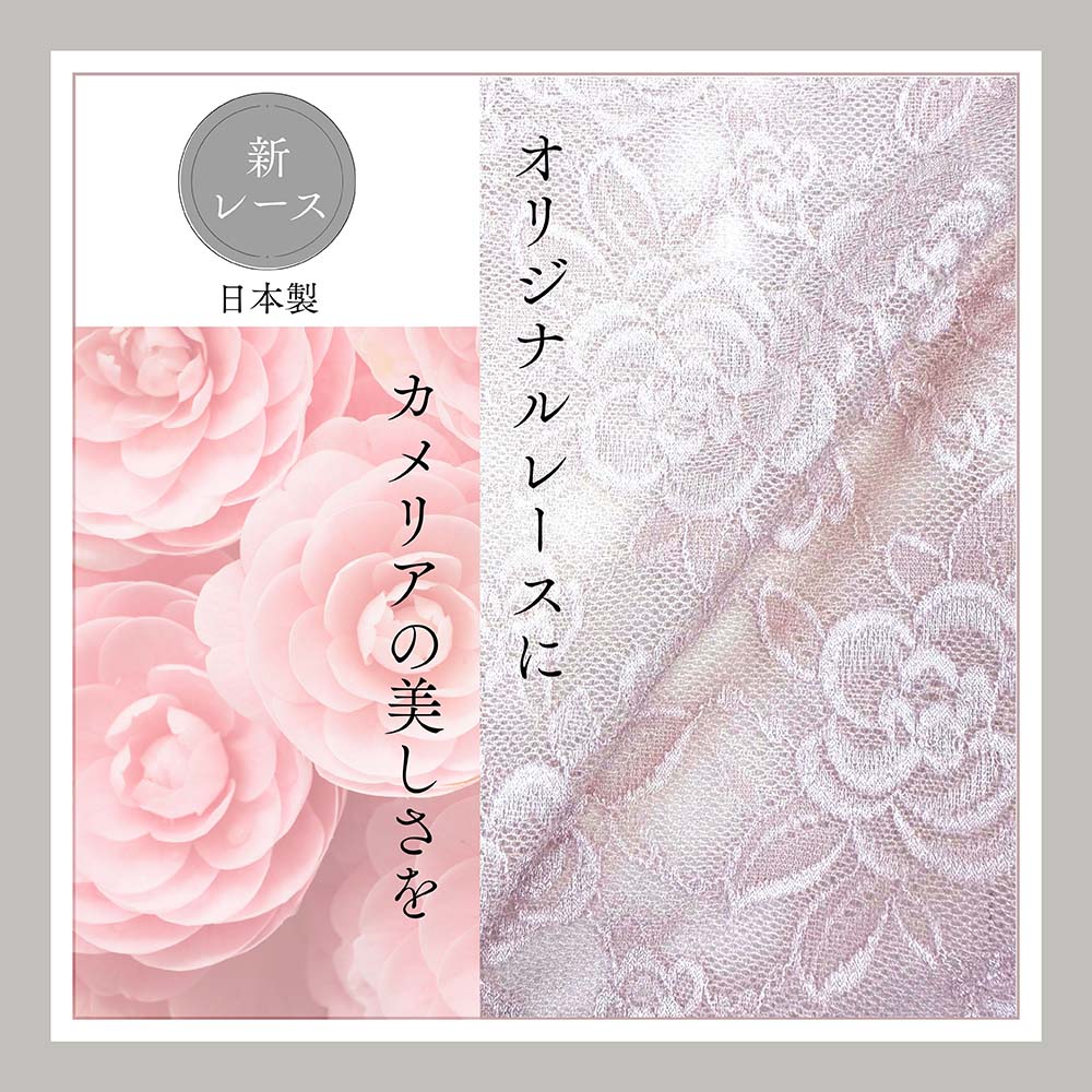 ブルーメリアシリーズのレースは、国内のレース工場で一から織り上げられたオリジナル。繊細な糸の選定から、花柄の立体感、肌なじみを考え、レースデザイナーがカメリアの花を丁寧に描いています。縫製工場では、熟練の職人がレースの扱い、カーブの縫い合わせ、着心地を左右する細かな調整まで一工程ずつ丁寧に縫製を行っています。補整下着でありながら「締めつけすぎない心地よさ」を実現するために、見えない部分にも多くの工夫が詰まっています。ワイヤー・ボーン不使用でもしっかり補整