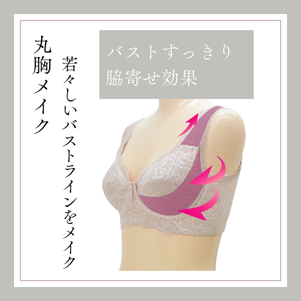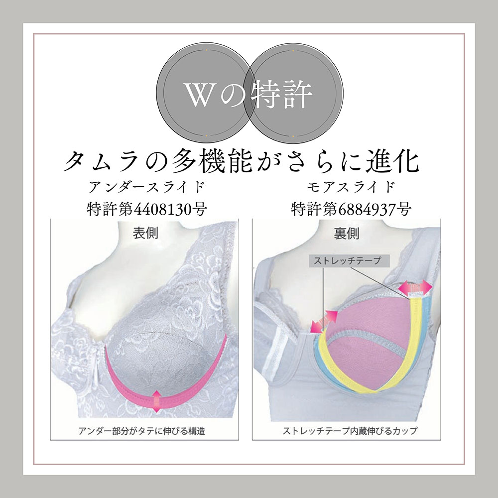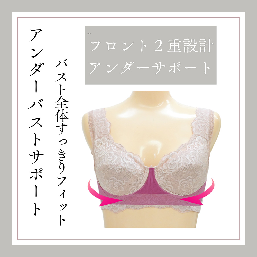 パワーネットの裏打ち効果することでワイヤーもボーンも入っていないのに、しっかりラクに補整できます。締めつけによる苦しさを感じることなく、しっかりとバストを支えます。アンダー部分はフロント2重設計で、ワイヤーがなくてもバストの下垂を防止。一日中着けていても疲れにくい着心地が魅力です。W特許のバストカップ設計、左右差や変化する体調にも対応