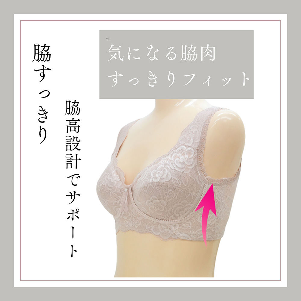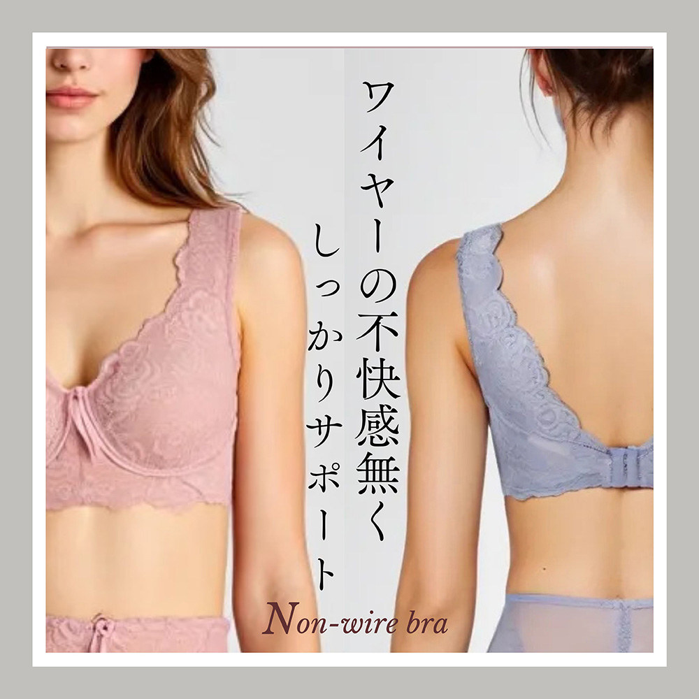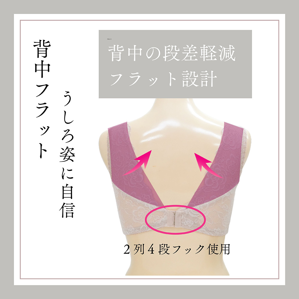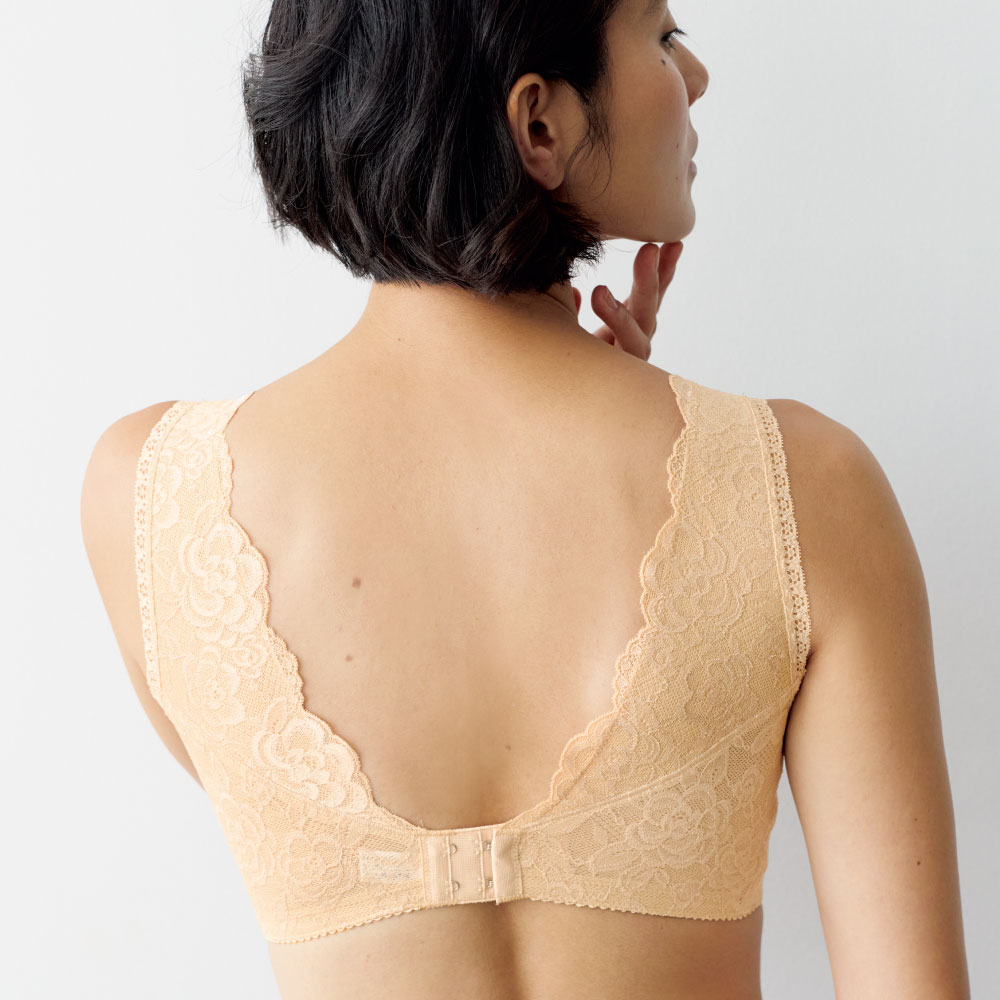 背中のストラップは独自のV字カット設計で背中に段差がつきにくく、アウターを着た時のラインもきれいです。幅広のストラップが肩への負担を軽減。ストレッチ性のあるレース使いで体の動きにやさしくフィットし、一日中快適に過ごせます。豊富なサイズ展開で、女性の多様な体型に寄り添う