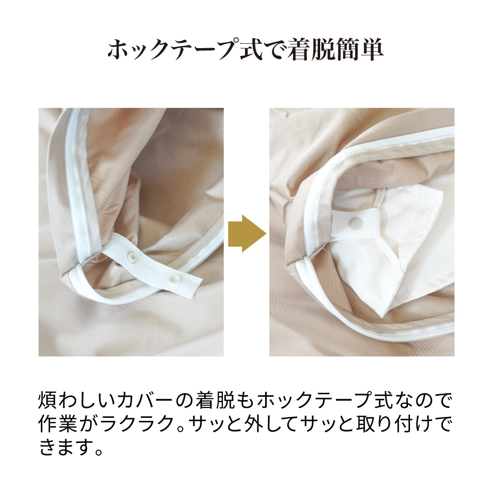 シーツの開口部を顔から遠ざけ、ファスナーの面積も減らすことで、ダニの侵入を減らす工夫を施しています。また、煩わしいカバーの着脱はホックテープ式なので、作業がらくらく。サッと外してサッと取り付けができます。