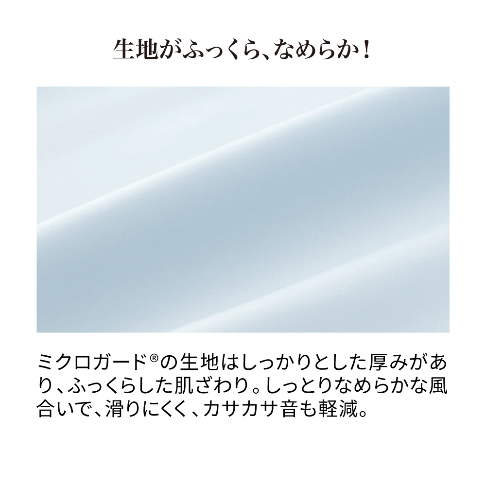 ミクロガード(R)の生地はしっかりとした厚みがあり、ふっくらした肌ざわり。しっとりなめらかな風合いで、滑りにくく、カサカサ音も軽減。