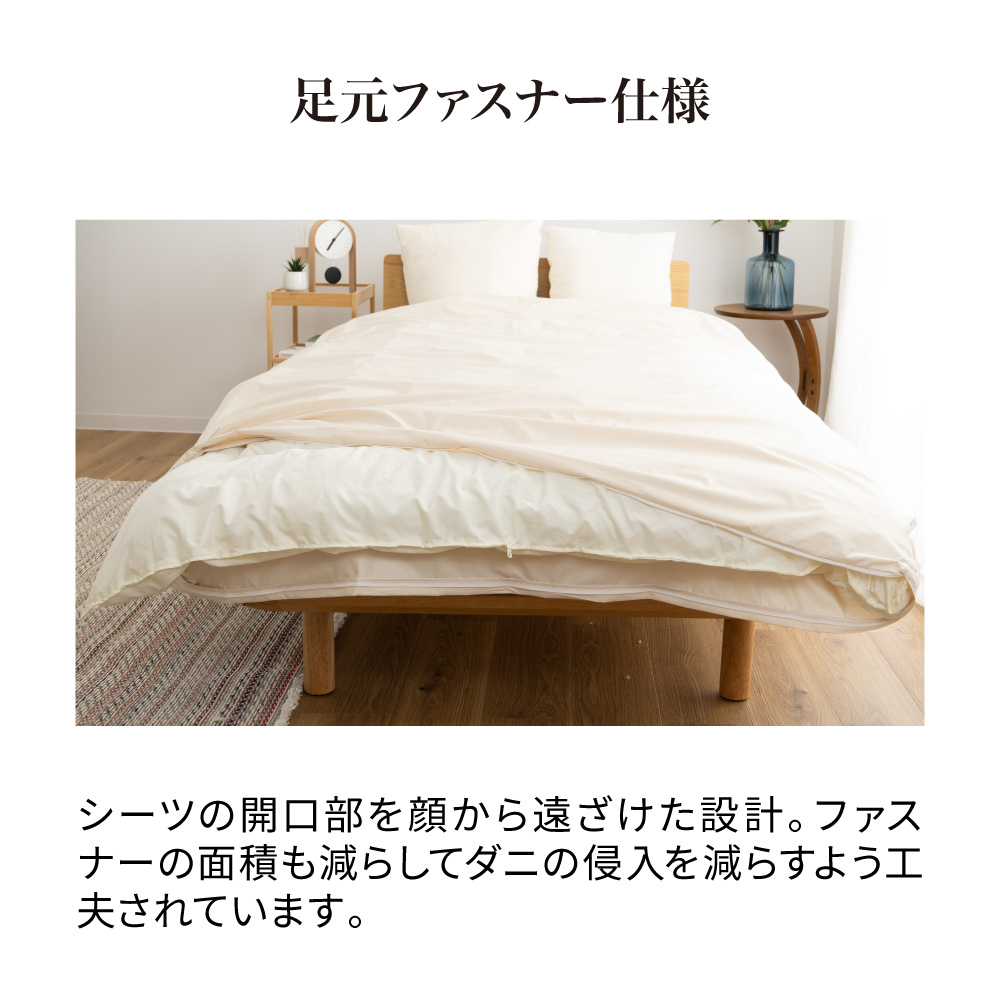 高密度生地で仕立てた掛け布団カバーで、なめらかな肌ざわりを楽しみながらしっかりダニ対策。針穴やファスナーからのダニの侵入まで防ぐ、こだわり仕様です。