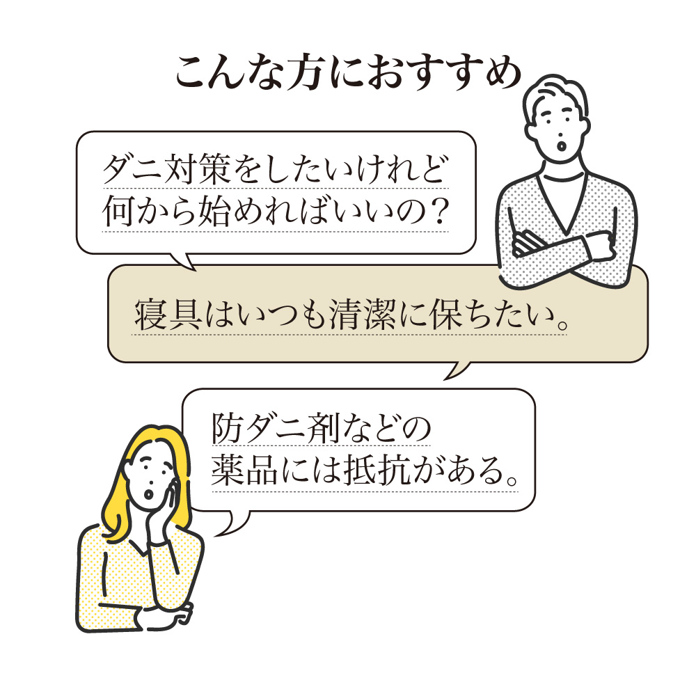 防ダニ剤を使わず、高密度生地だけでダニをしっかり遮断。お使いの寝具に装着するだけの気軽さで本格的なダニ対策を始められます。