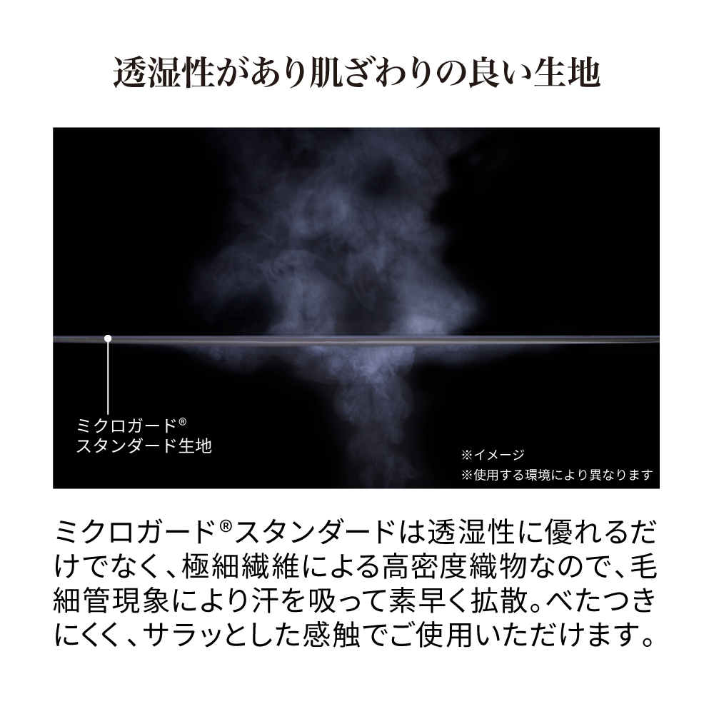 ミクロガード(R)の生地はしっかりとした厚みがあり、ふっくらした肌ざわり。しっとりなめらかな風合いで、滑りにくく、カサカサ音も軽減。