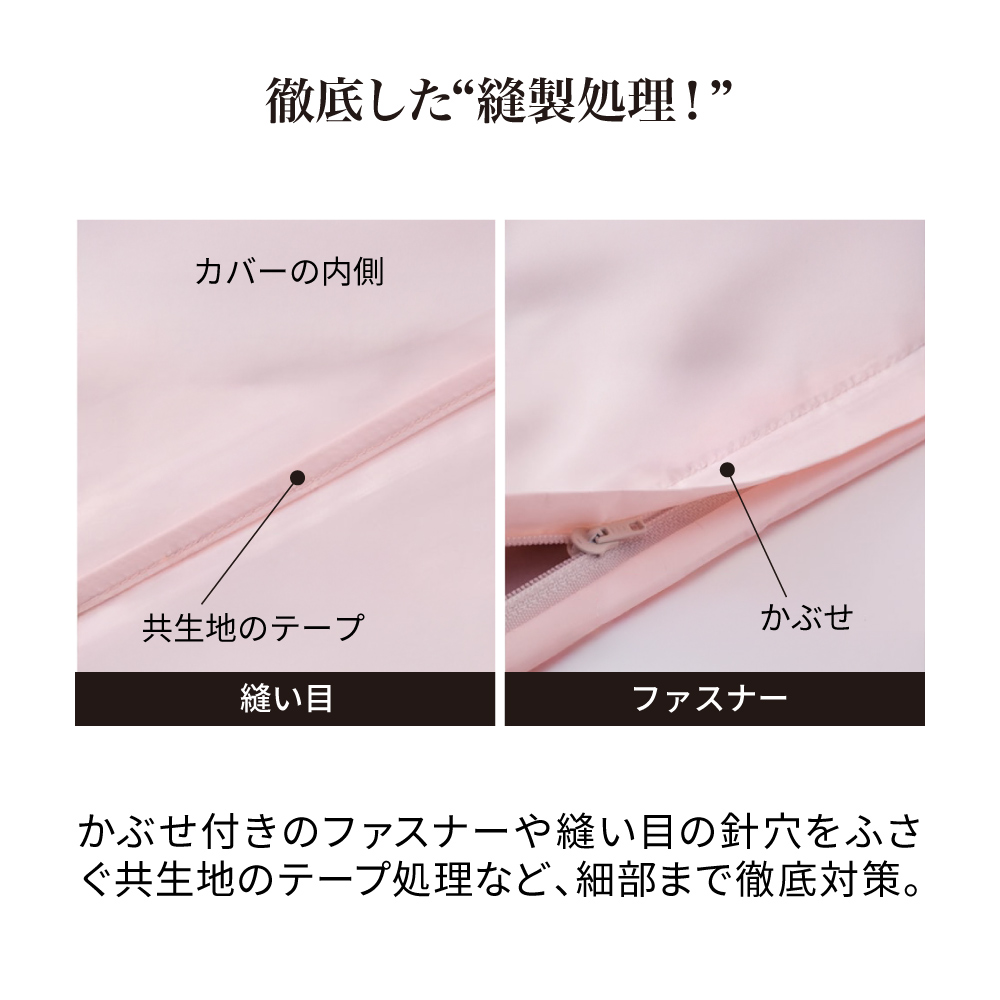 高密度生地で仕立てた掛け布団カバーで、なめらかな肌ざわりを楽しみながらしっかりダニ対策。針穴やファスナーからのダニの侵入まで防ぐ、こだわり仕様です。