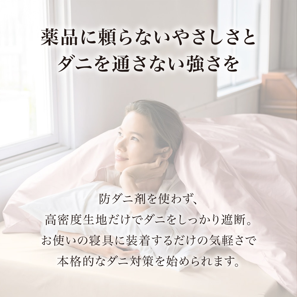 防ダニ剤を使わず、高密度生地だけでダニをしっかり遮断。お使いの寝具に装着するだけの気軽さで本格的なダニ対策を始められます。
