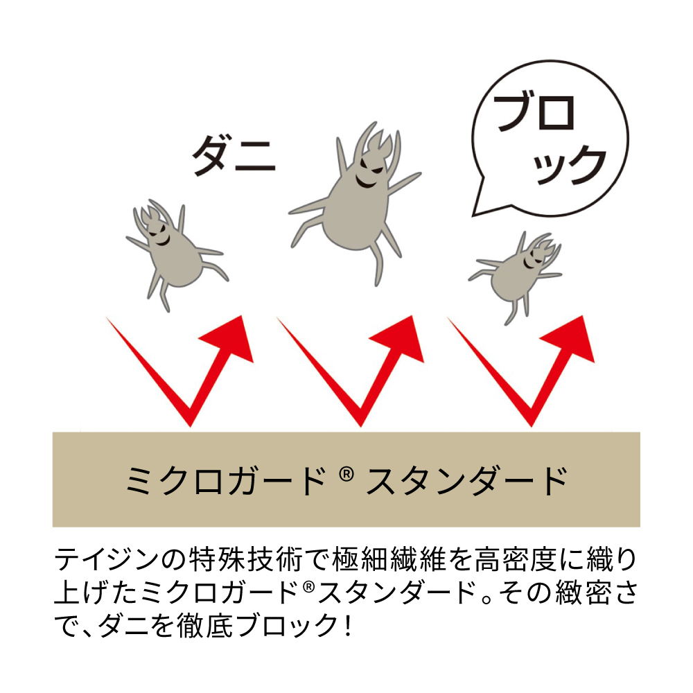 テイジンの特殊技術で超極細繊維を高密度に織り上げたミクロガード(R)スタンダード。その緻密さで、ダニを徹底ブロック!