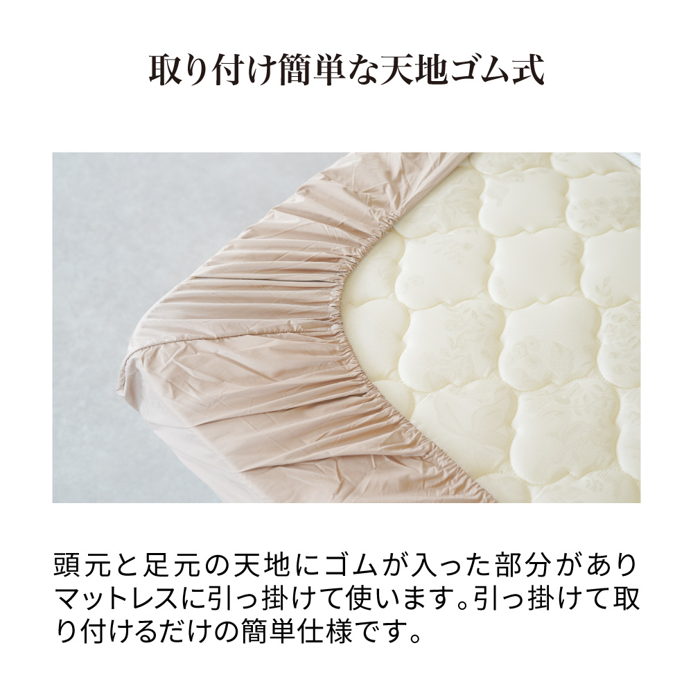 頭元と足元の天地にゴムが入った部分がありマットレスに引っ掛けて使います。引っ掛けて取り付けるだけの簡単仕様です。