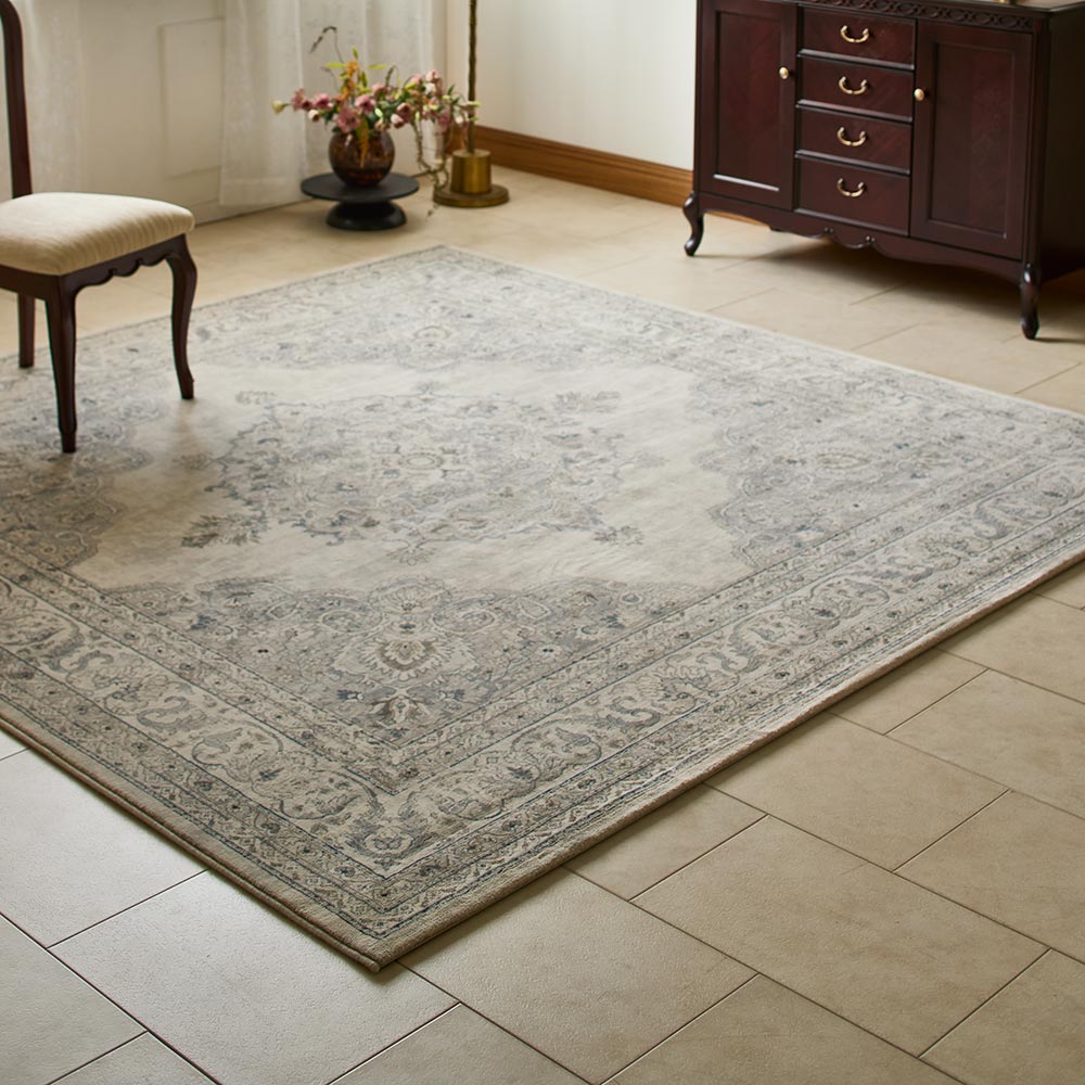 クラシカルな宮廷柄のベルギー製ラグ。アンティーク調でヴィンテージを加工をしているようなかすれ感が現代的であり魅惑的な印象を醸し出します。