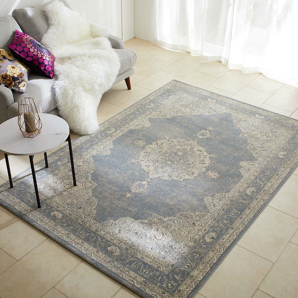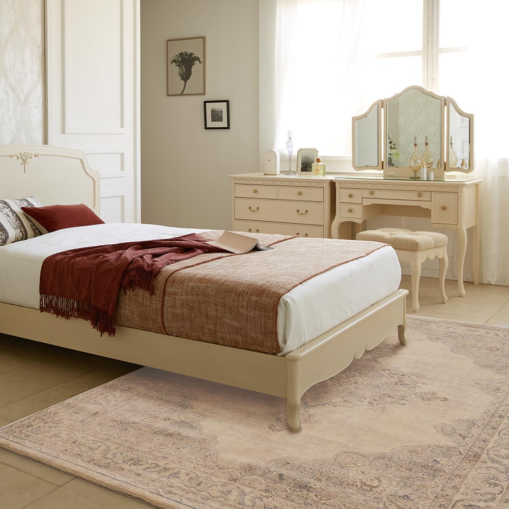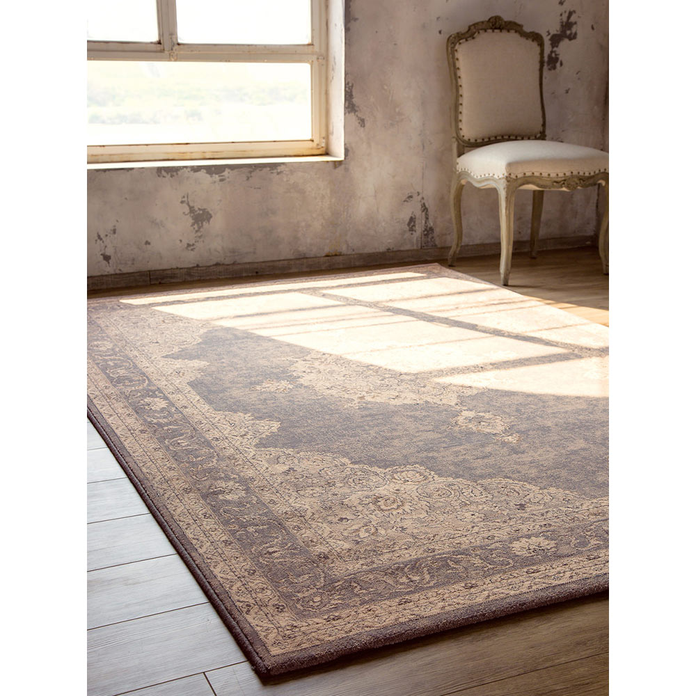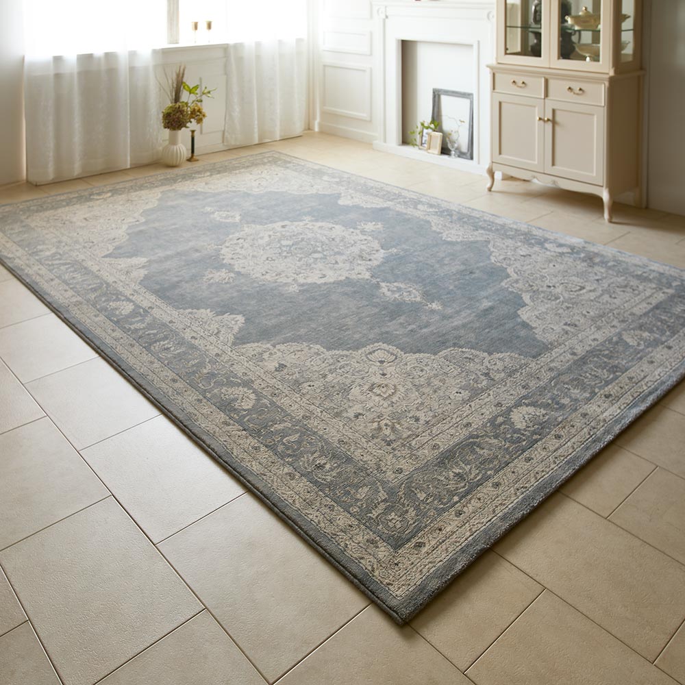 クラシカルな宮廷柄のベルギー製ラグ。アンティーク調でヴィンテージを加工をしているようなかすれ感が現代的であり魅惑的な印象を醸し出します。