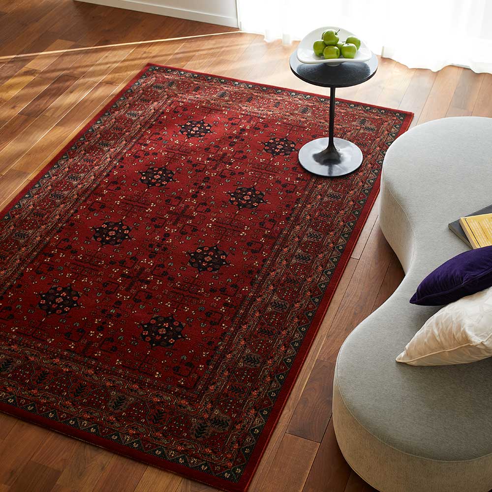 670000ポイントという高密度の織りで細かな柄やビンテージ感を表現しています。耐久性に優れたウールラグは、しっかりとした踏み心地と天然素材の気持ちの良い質感を楽しめます。永く愛される本物志向のこだわり抜いた上質ラグです。