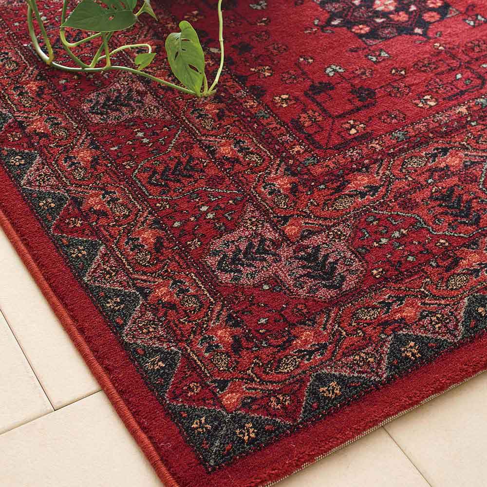 エスニック感あふれるデザインをモチーフに、深みのあるレッドとかすれたような色使いがヴィンテージ感を表現。 ヴィンテージなスタイルにはもちろん、アメリカンテイストやモダンデザインのインテリアにも合わせやすい1枚です。ウール素材を使用しているので、1年中使用可能です。
