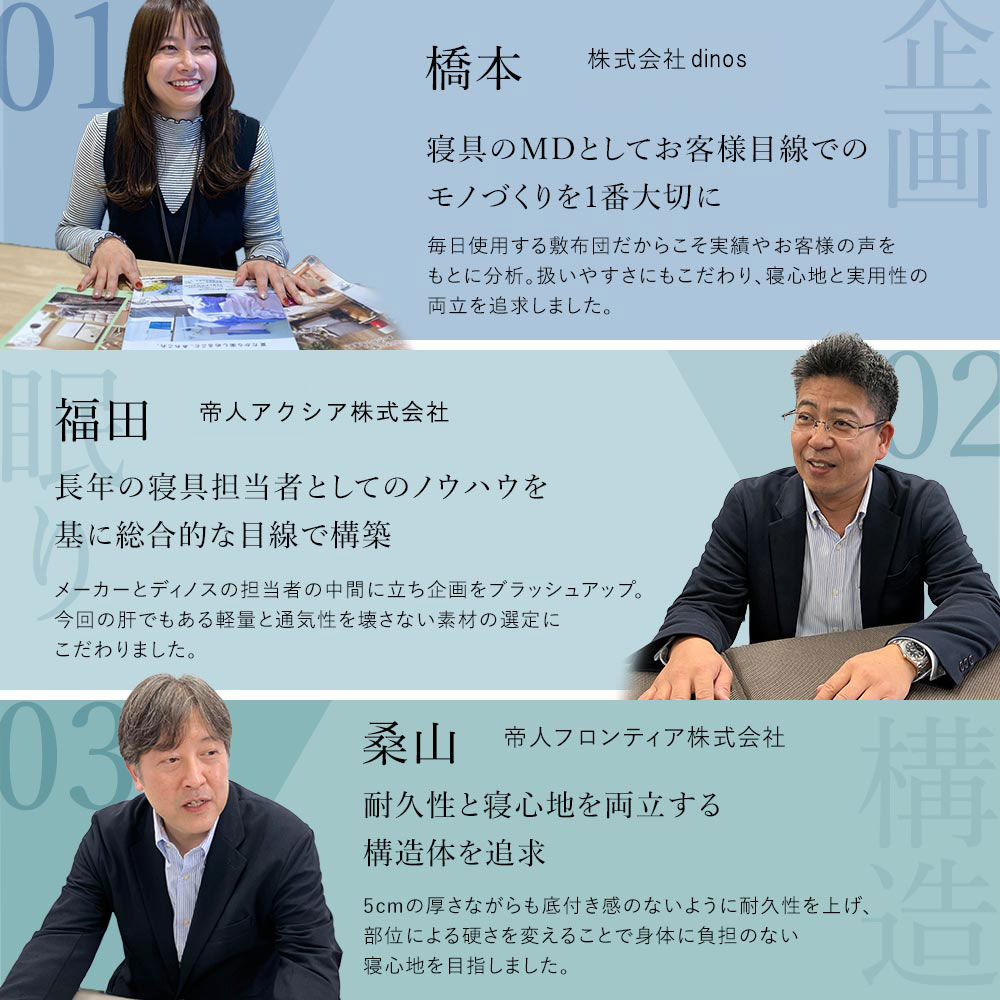 • 敷布団ユーザーへのアンケート結果をもとに理論、素材、技術、そしてお客様目線とそれぞれの分野における“日本の匠”たちが、知識と経験、熱い想いを持ち寄って「床に直接寝る人へ向けた敷布団」をつくりました。