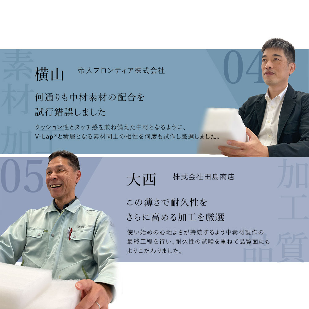 • テイジンの特殊成形構造体「V-Lap®」。繊維がタテ方向に配列した不織布構造の「V-Lap®」は軽量・通気性と弾力を併せ持ち、身体をしっかりと支え、快適な寝心地をサポートします。