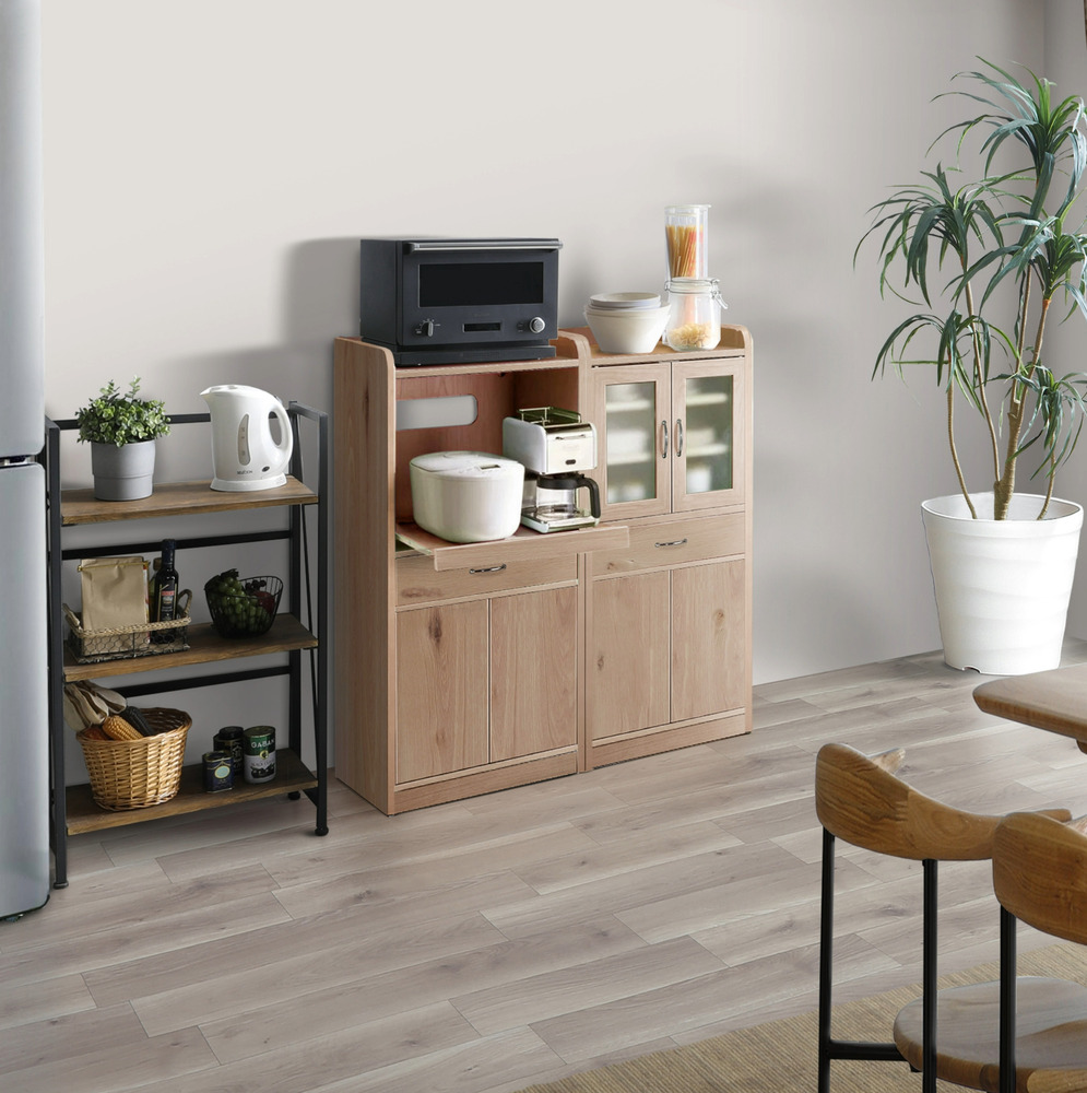狭いキッチンに対応する、コンパクトな「ミニ食器棚シリーズ」のレンジ台。食器・家電をもおしゃれに収納でき、圧迫感もありません。新婚やお引っ越し、一人暮らしにおすすめのキッチン収納です。シリーズ品のキャビネットと合わせて使えば、統一感のあるキッチンに。