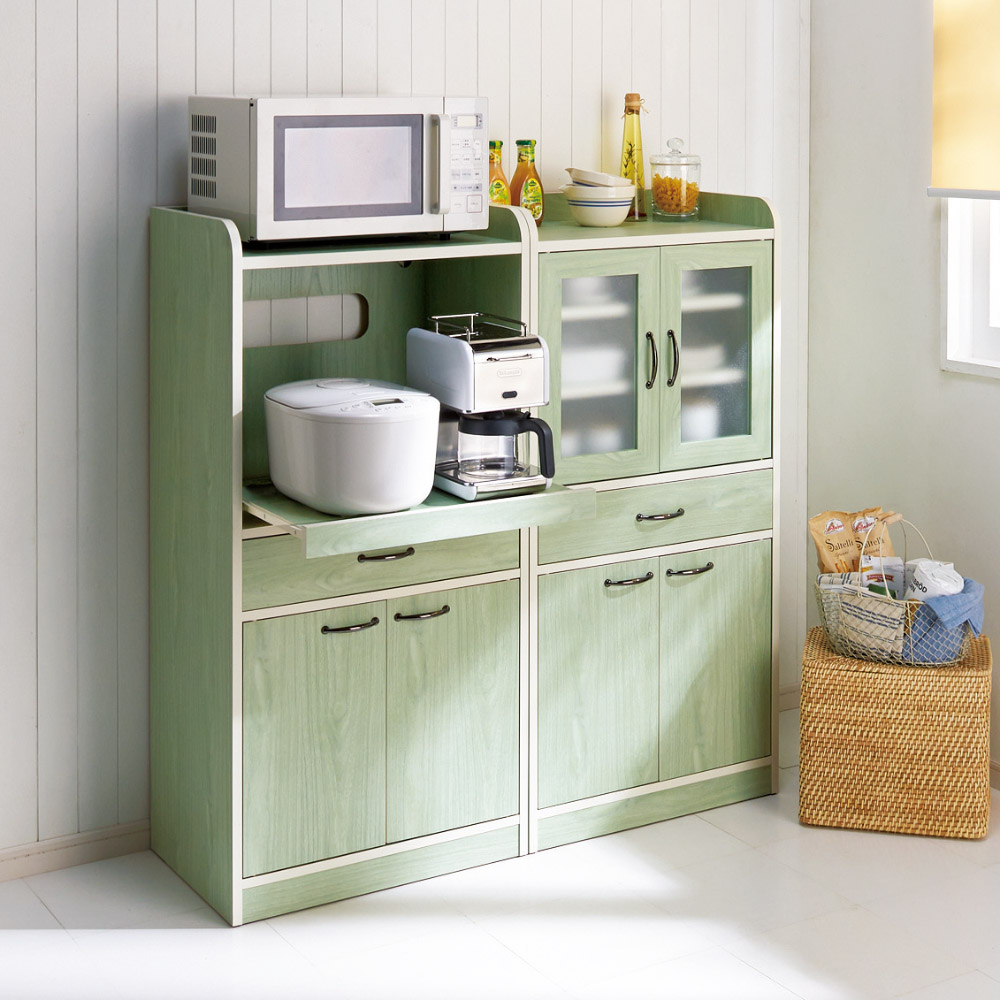 使用例:グリーン系 左からレンジ台大、キャビネット大(高さ120.5cm)