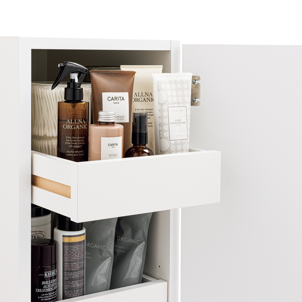 ◆スライドトレータイプなので、細々した物が多いサニタリー用品を取り出しやすく収納できます。◆トレーは棚と比べて細かいものでも落ちにくく出し入れの時にも便利です。