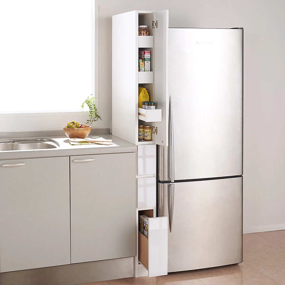 上段は奥の物が出しやすいスライドトレー、下段は引き出し3杯付きのすき間収納庫。