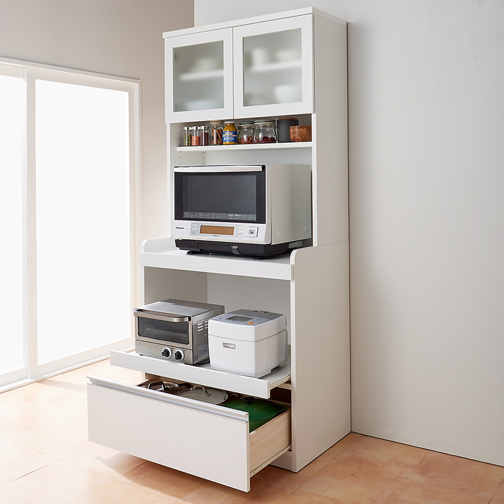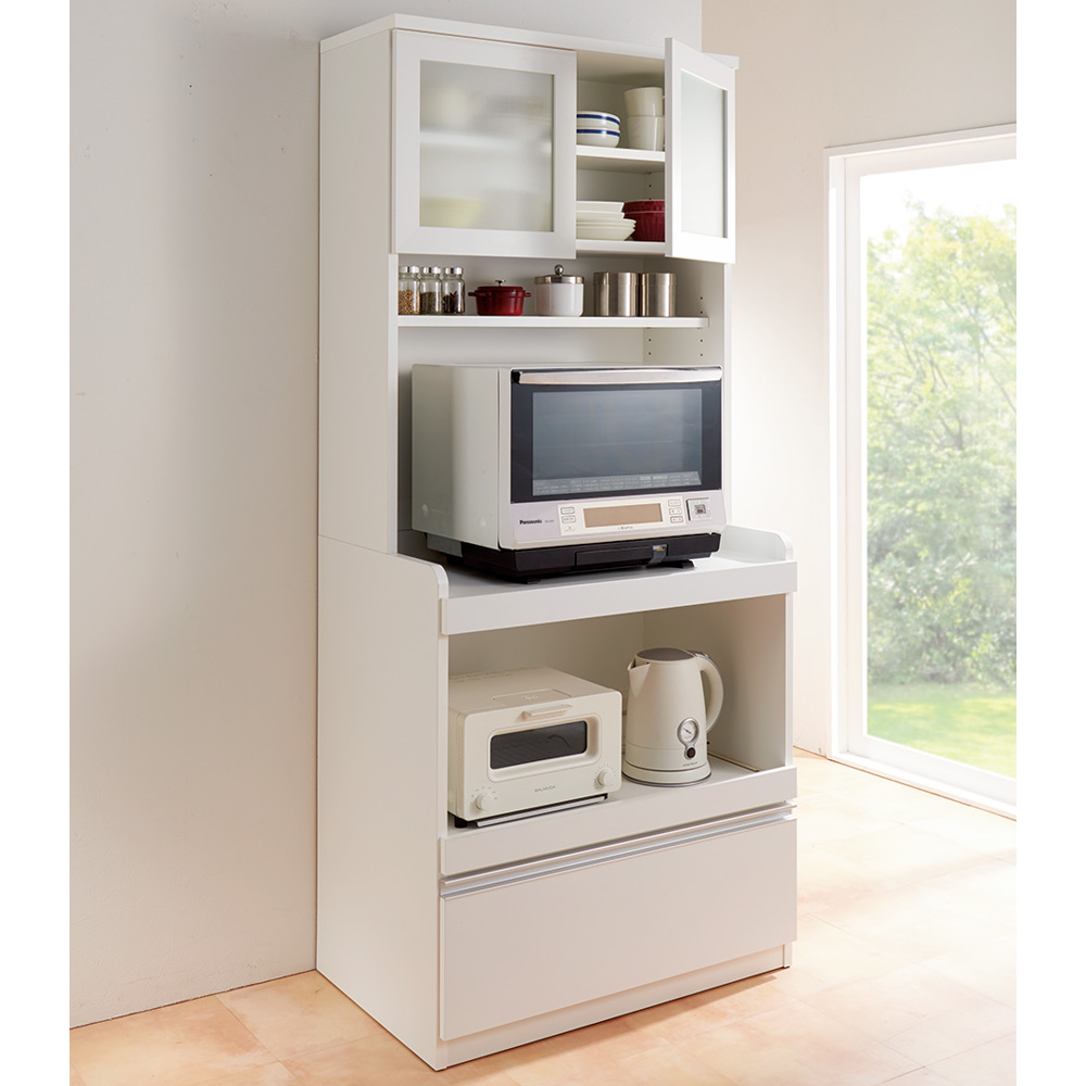 ◆本体奥行き50cmなので大型レンジをラクラク収納可能な食器棚です。◆余裕のあるスペースで必要な家電を使いやすく並べられるカップボードです。