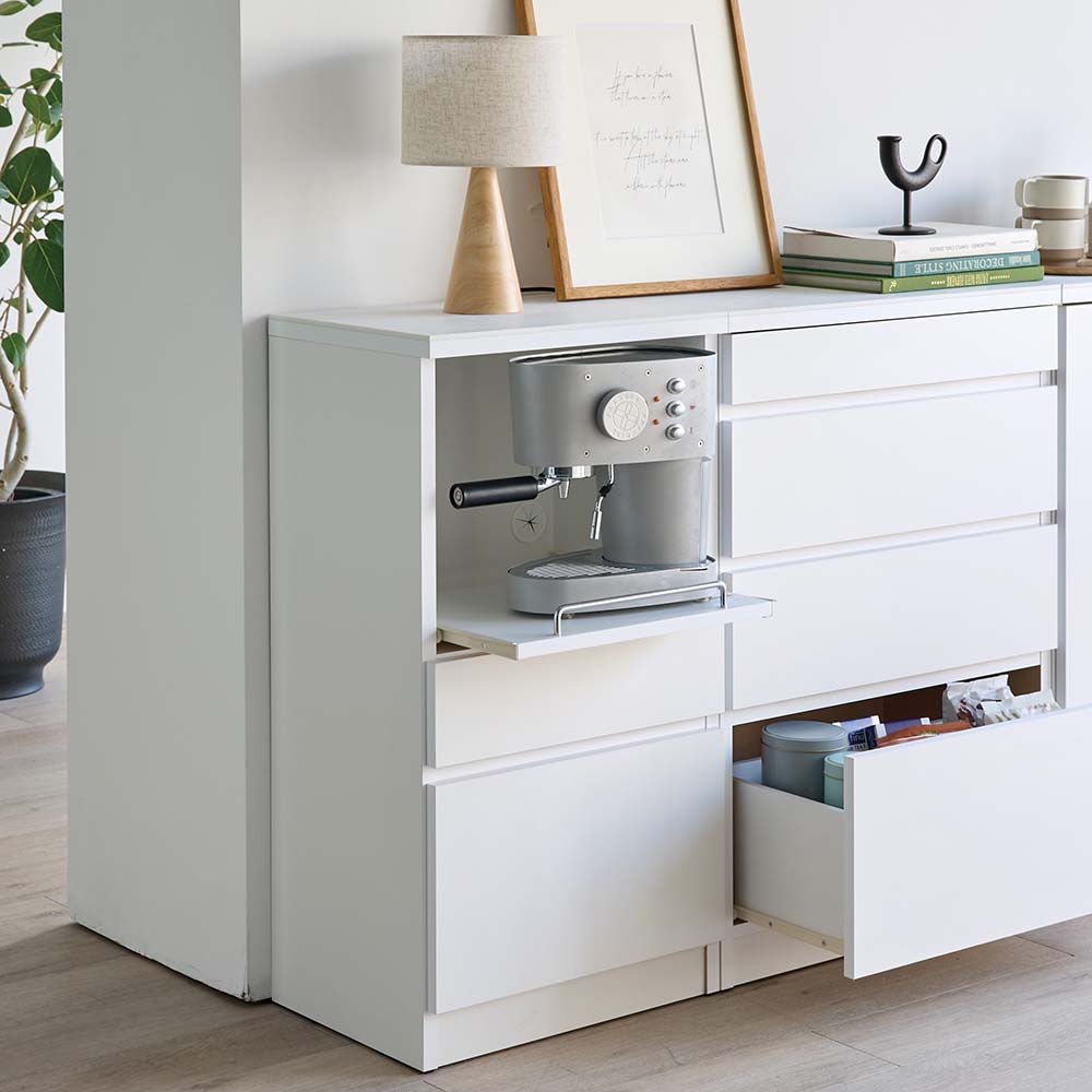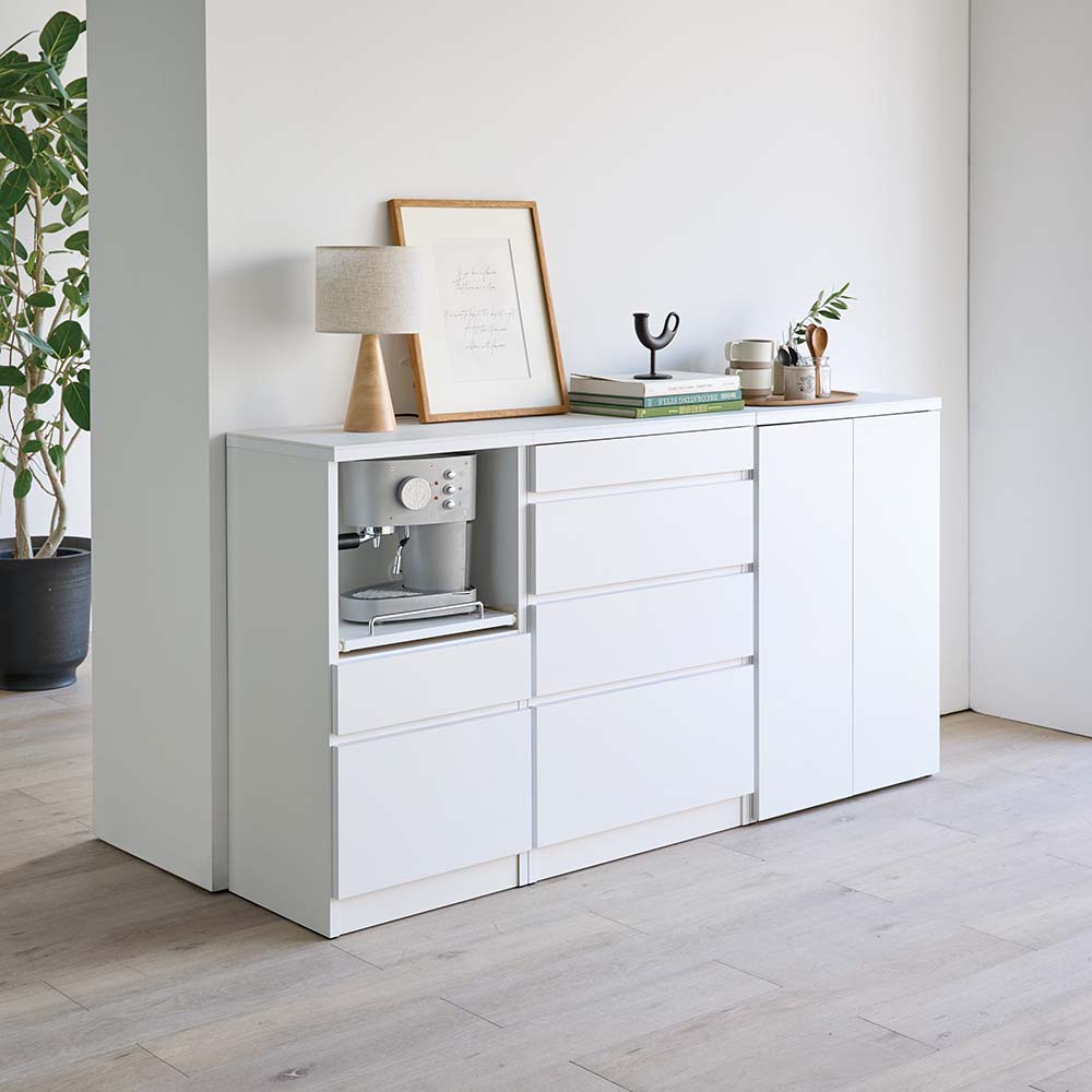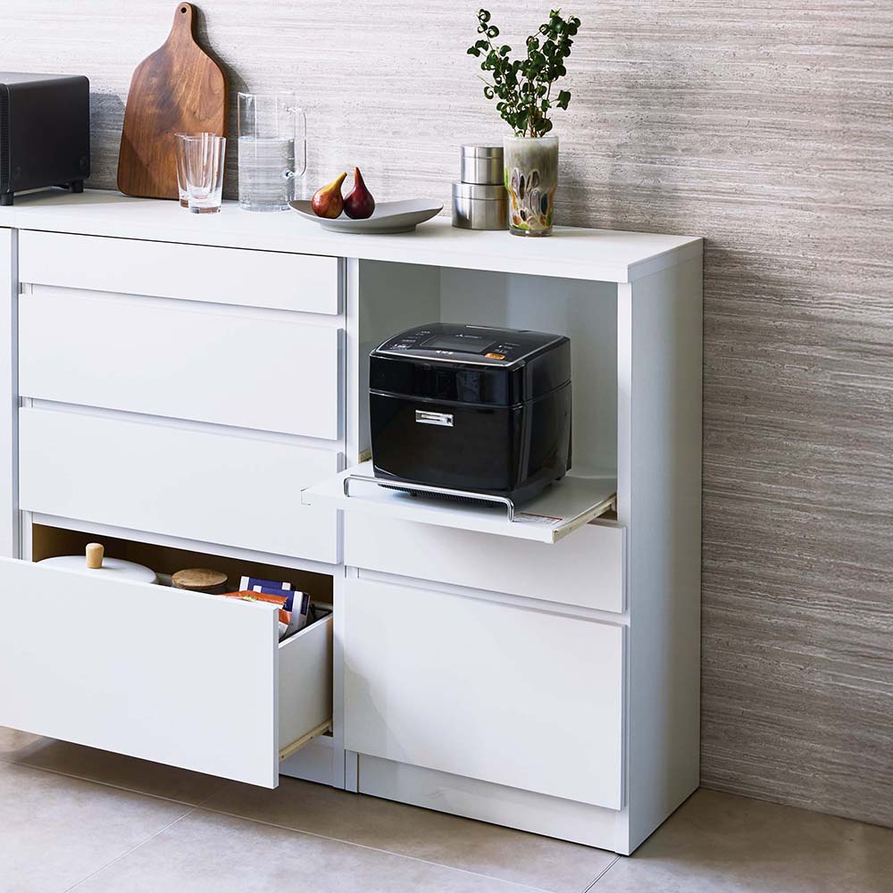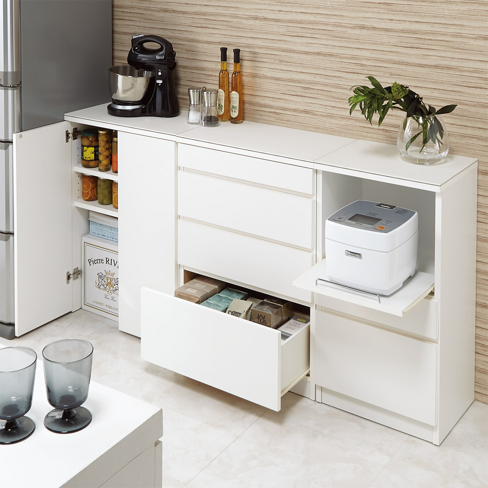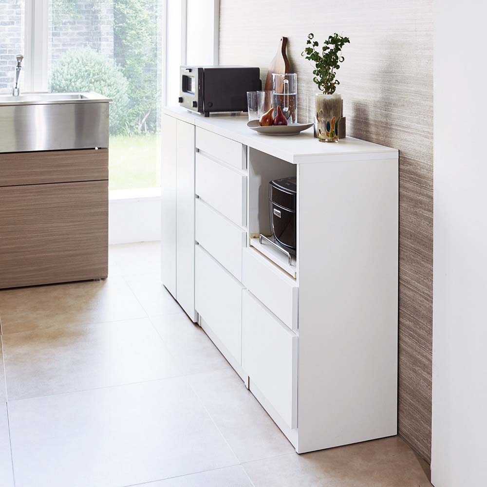 奥行34cmの薄型設計で、狭いキッチンの通路の邪魔にならないすっきりとしたキッチンカウンター。家電収納や引き出しチェスト、扉収納などを組み合わせて。