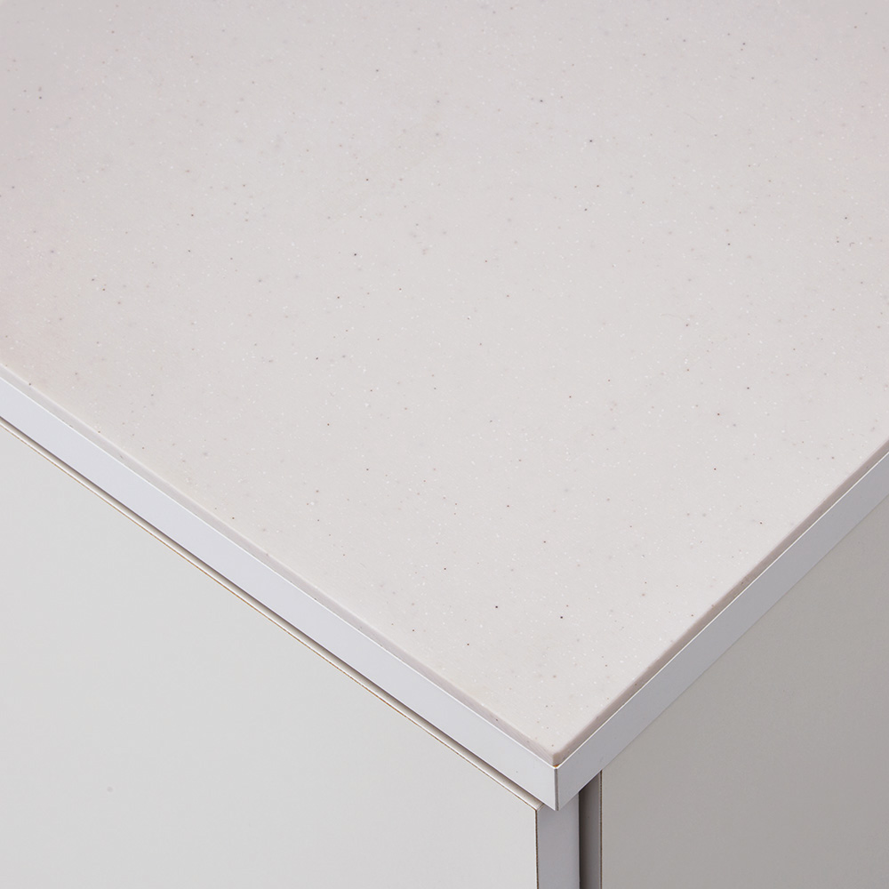 天板はキッチンのワークトップにも使われる、耐久性があり細かな斑が美しい人工大理石。独特なマットな質感は、ワンランク上の贅沢な相上がり。