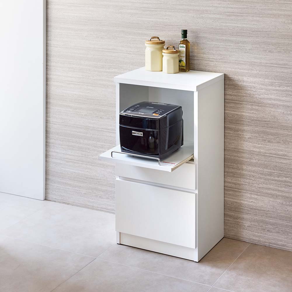 ◆家電収納タイプは、家電台・レンジ台として小ぶりなキッチン家電を乗せて使えるスライドテーブル付き。◆奥に配線用のコード穴付きでコードの処理も簡単。