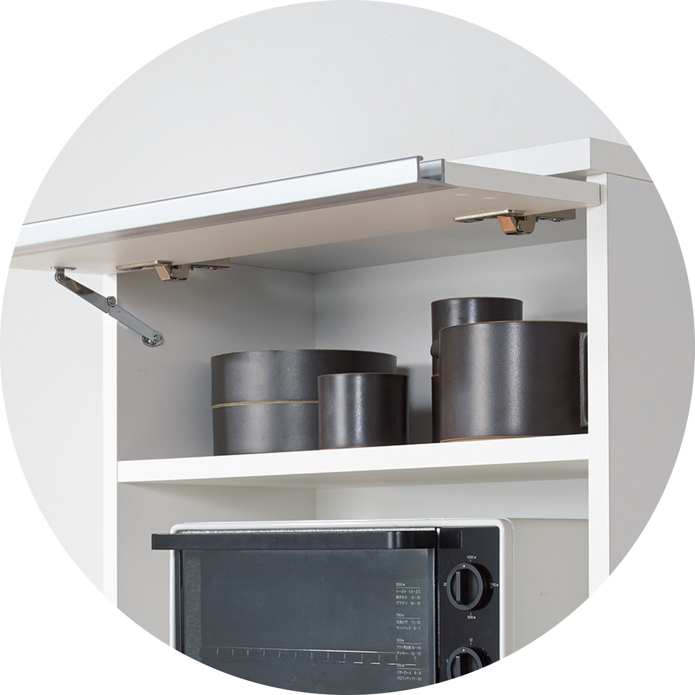 扉は上に持ち上げて開くタイプ。大きく開いて物の出し入れもしやすく楽々。