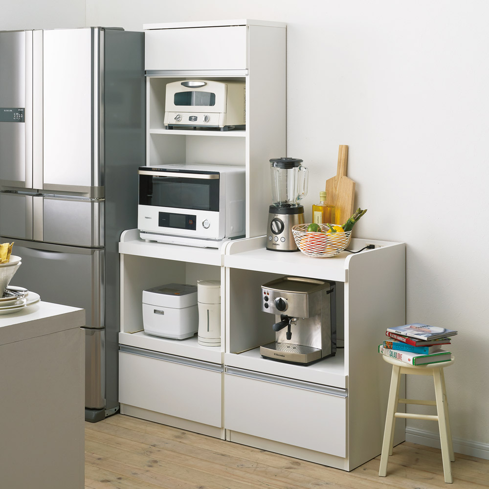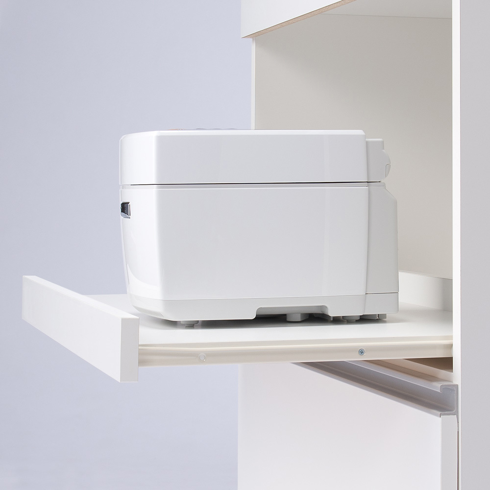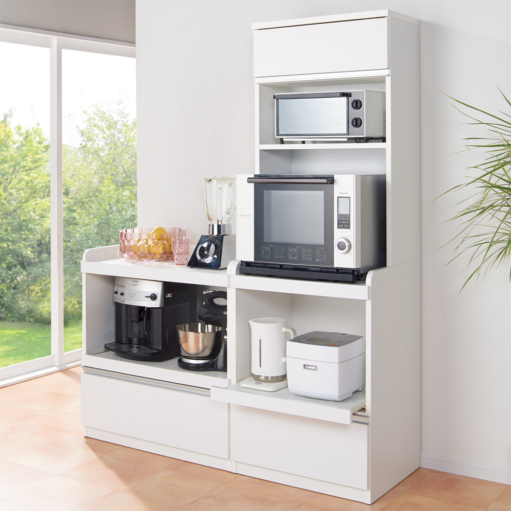 ◆定位置が必要なキッチン家電収納のために、コンセントつきのオープン家電台を装備。◆レンジ、トースター、炊飯器、ホットプレートなどキッチン家電は全てこれ1台にまとめて収納できます。