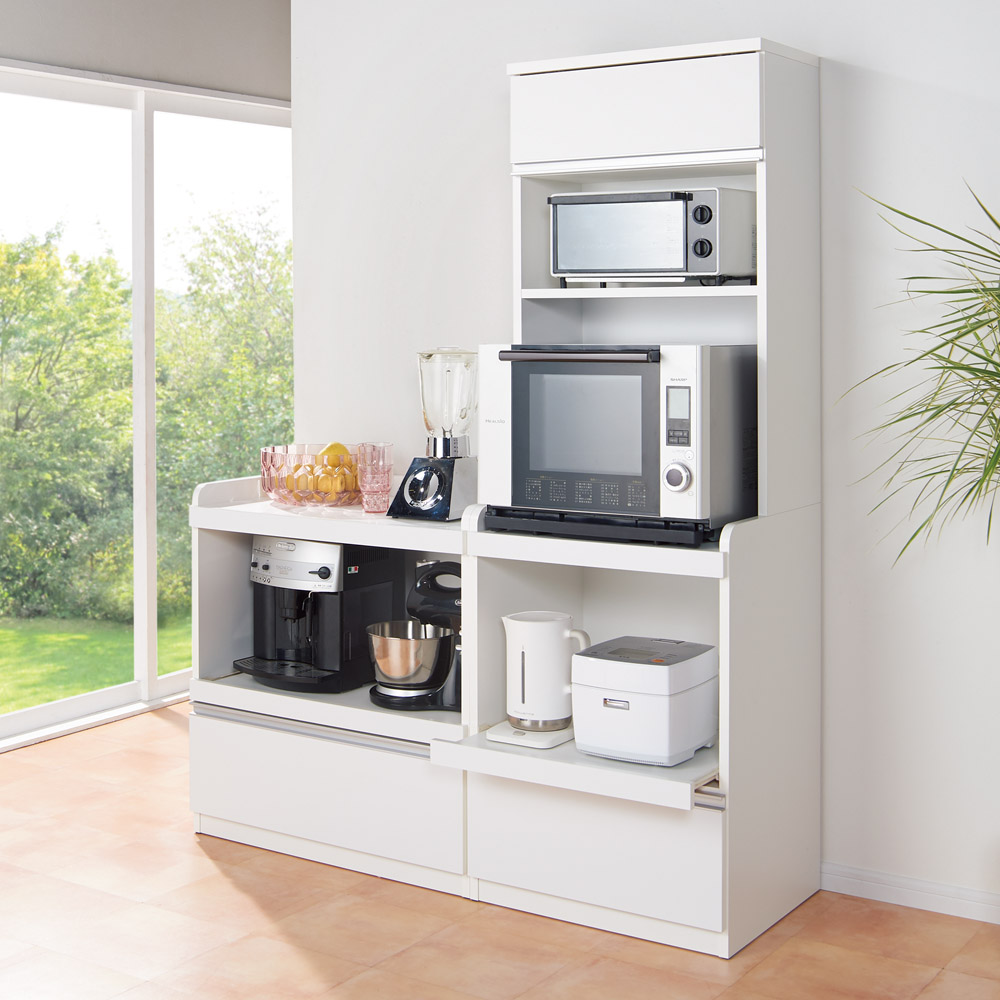 ◆定位置が必要なキッチン家電収納のために、コンセントつきのオープン家電台を装備。◆レンジ、トースター、炊飯器、ホットプレートなどキッチン家電は全てこれ1台にまとめて収納できます。