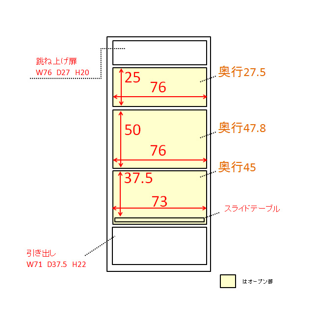 扉は上に持ち上げて開くタイプ。大きく開いて物の出し入れもしやすく楽々。