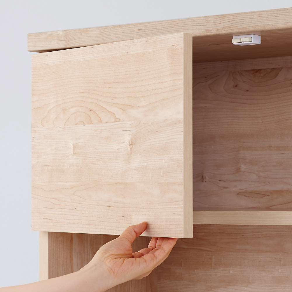 温かみのある天然木調の木目が特徴で、お部屋を北欧のテイストに包み込みます。シリーズ品のキャビネットと組み合わせたコーディネートも可能。キャビネットは扉タイプ・引き出し&オープンタイプがあります。