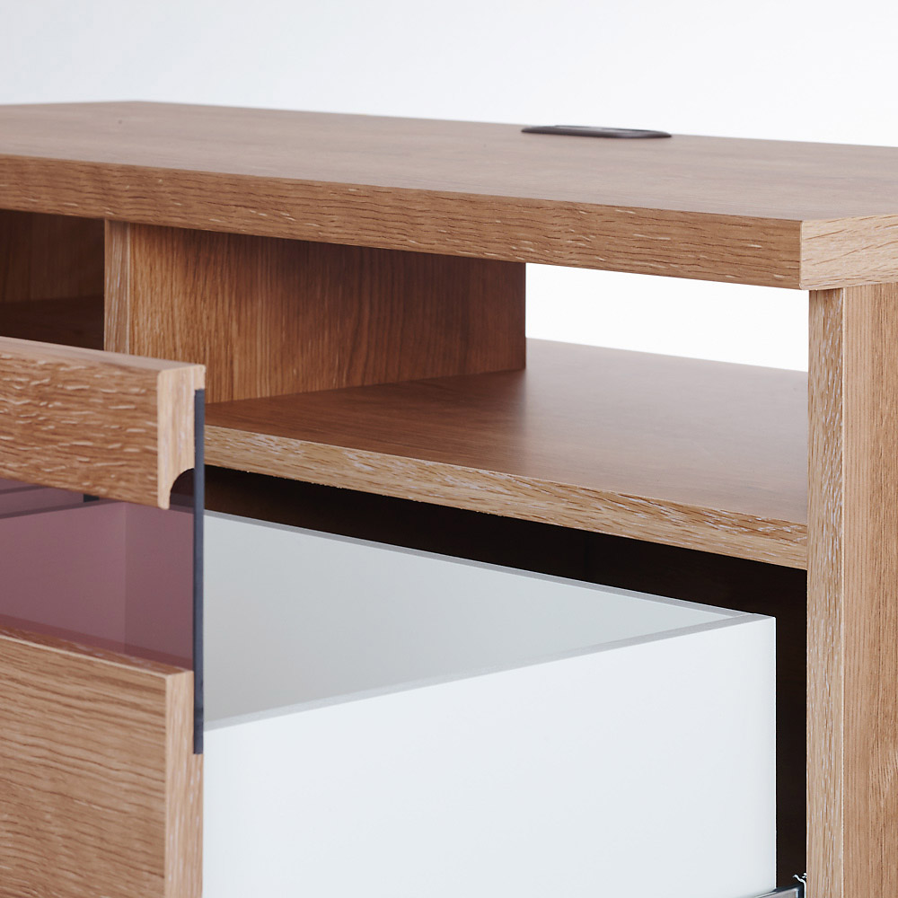 上台扉の中は内寸高さ26cm。DVDも余裕をもって収納できます。引き出しは奥のモノも取りやすいフルスライドレールを使用しており、開閉がスムーズです。