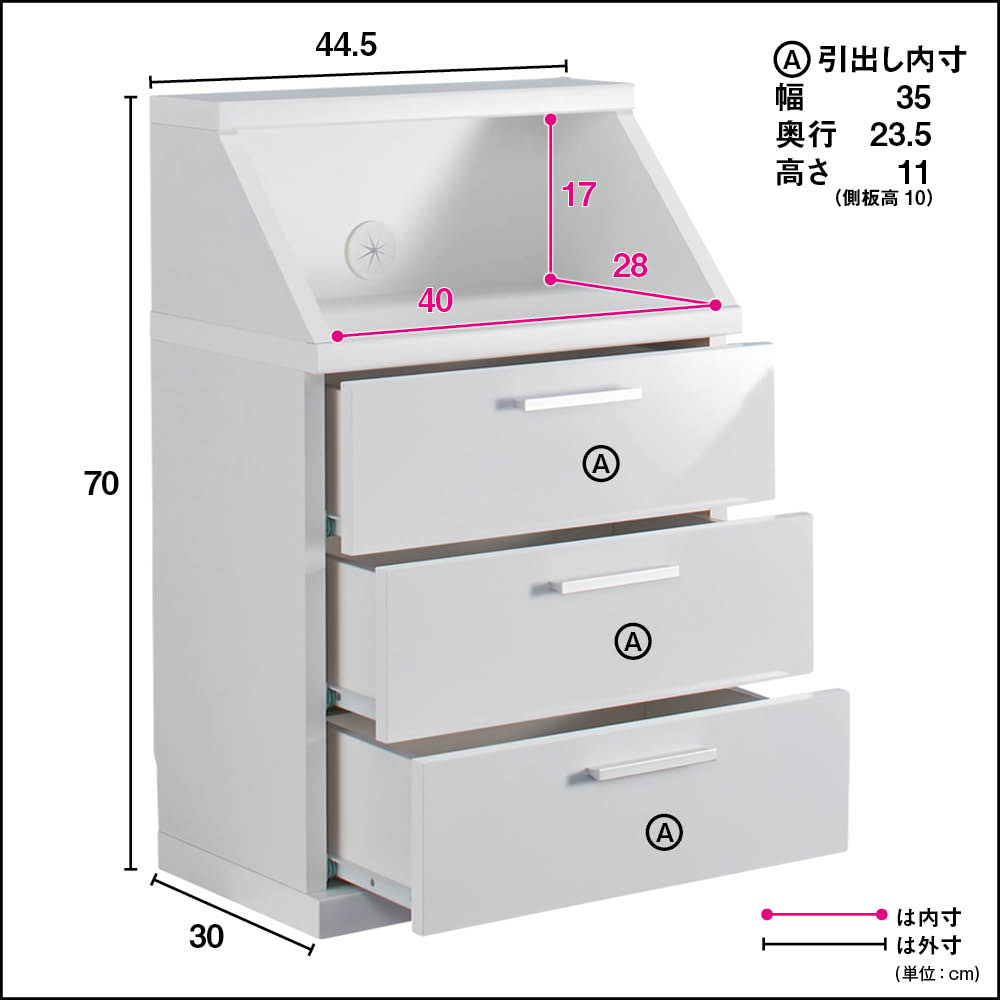 ◆上部には、有効高さ17cmのオープン収納スペースがついており、2口コンセントとコード穴付き。(引き出しタイプは2口コンセントなし)