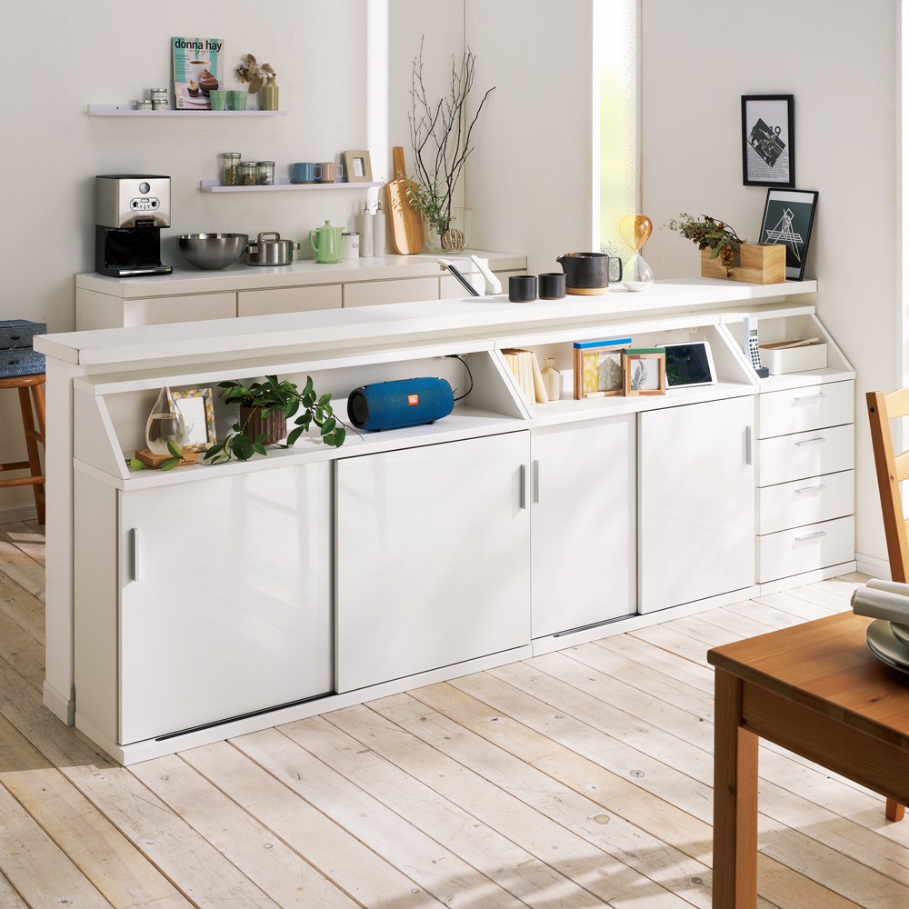 高さ70cm・85cmから選べるカウンター下収納庫。高さ70cmは一般的なダイニングテーブルの高さに合わせており