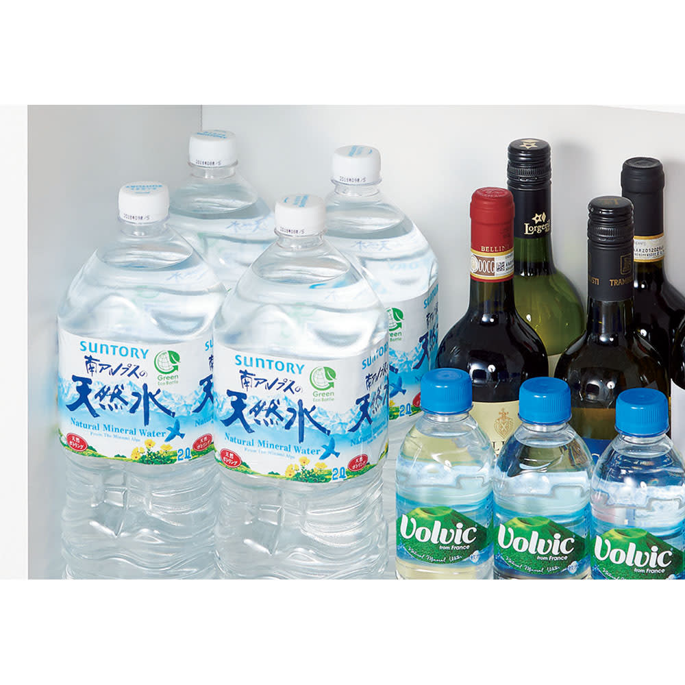 • 【収納例】幅30cm×奥行55cmタイプ(内寸:幅26.5cm×奥行51cm):500mLペットボトル・缶やワインの瓶、調味料の1Lボトルが3本並んで収まります。2Lペットボトルなら2本並んで入る大容量です。棚板は立ち上がりを付け、収納物が落下しにくい仕様です。