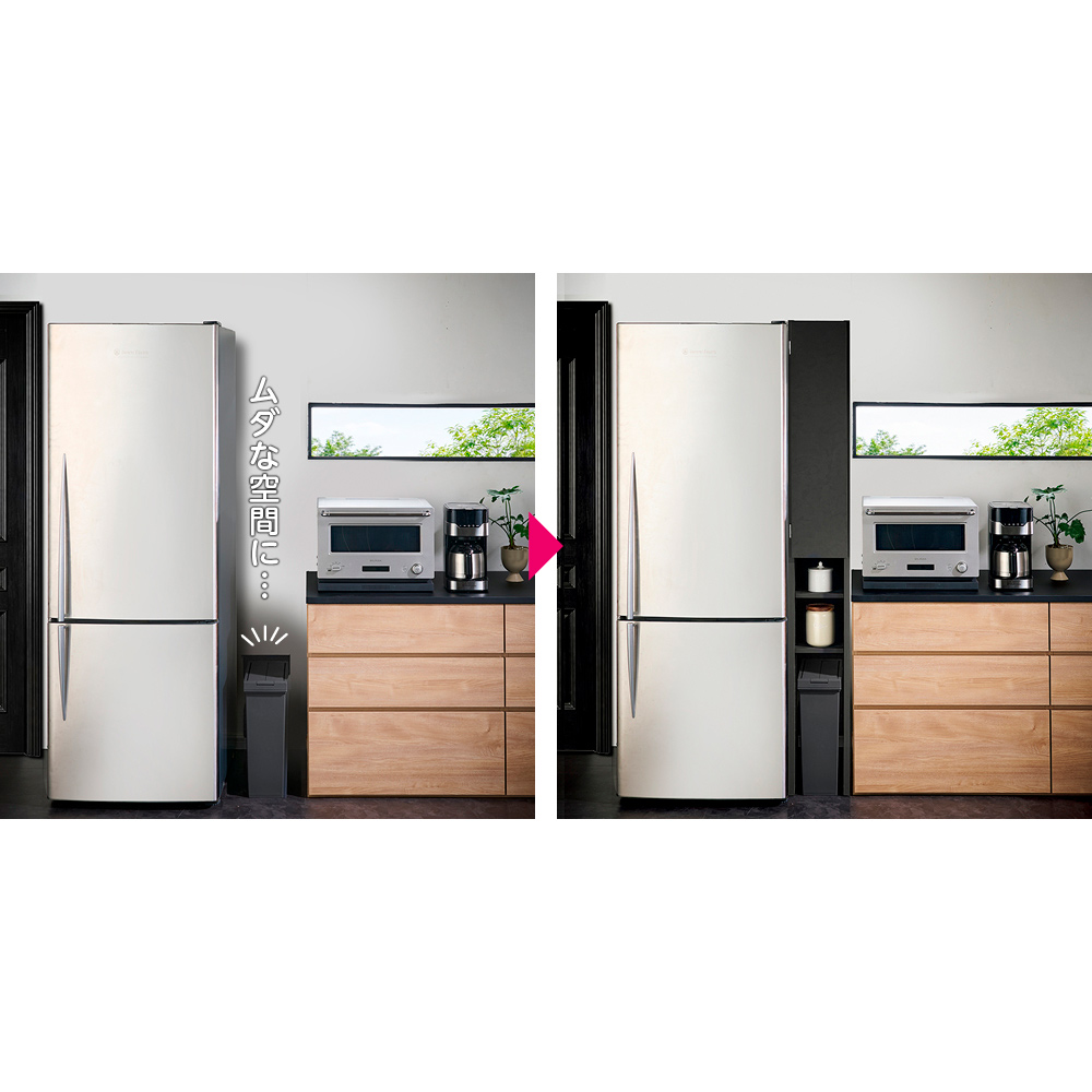 (ア)ブラック キッチンのすき間があっという間に大量収納庫に。1cm単位で幅が選べるので冷蔵庫横の中途半端なすき間にもジャストフィット。 ※写真は幅22cmタイプです。
