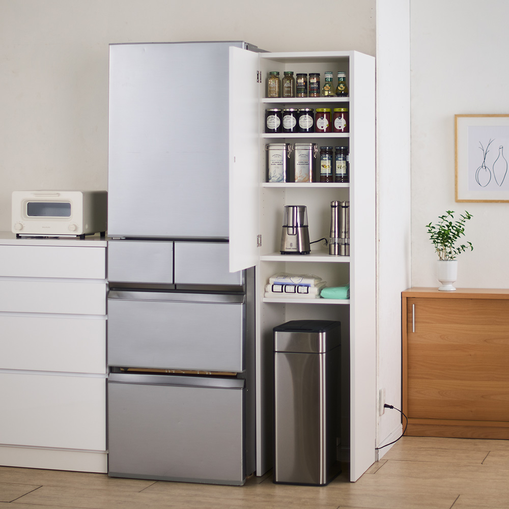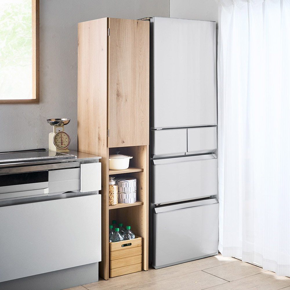 (イ)ナチュラルオーク 冷蔵庫横のすき間にも。上段は扉付きで収納物を綺麗に隠して収納できます。 ※写真は幅35cmタイプです。