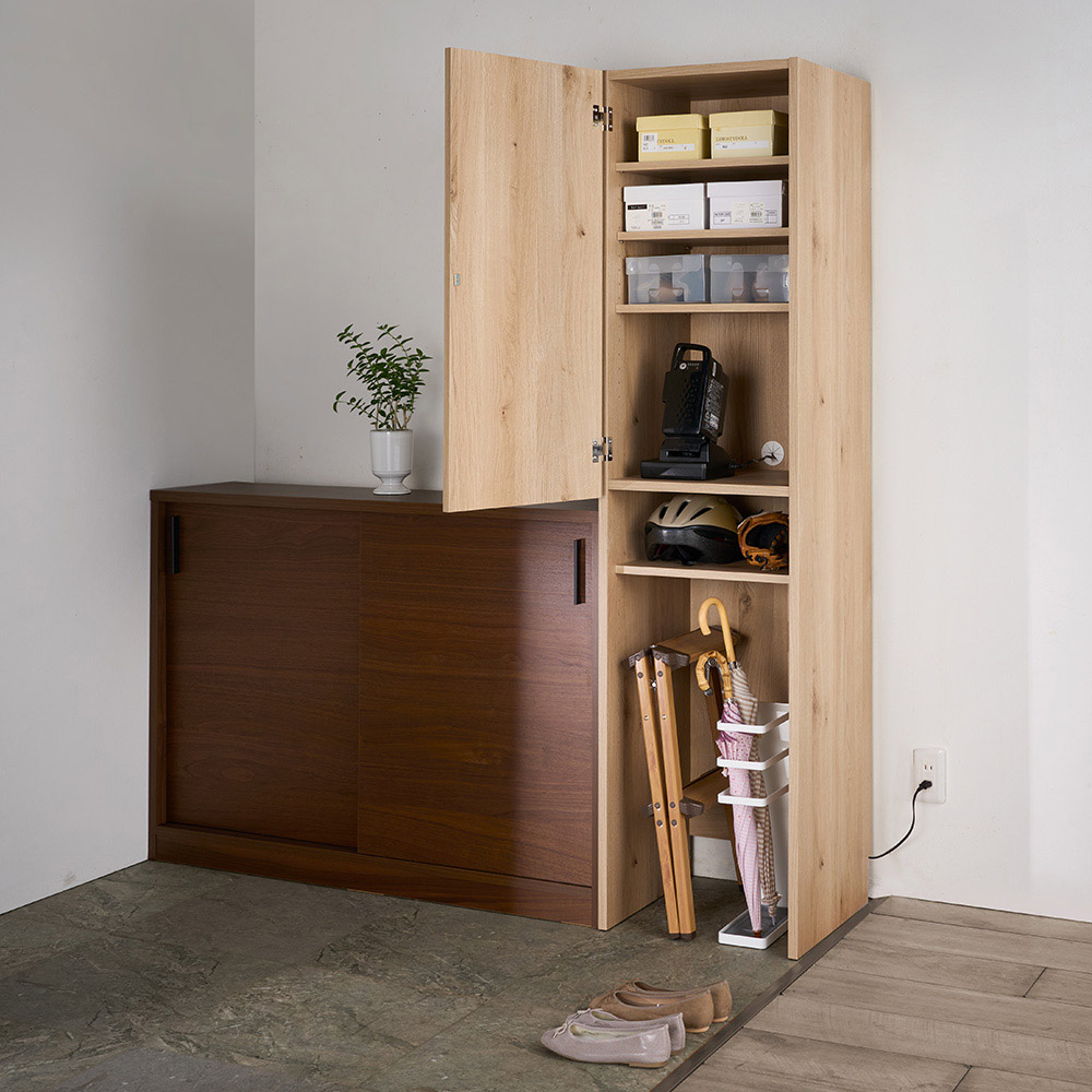 (イ)ナチュラルオーク 玄関にも。中央の棚の奥にはコード穴があり家電も収納できます。下段にはコードが逃がせる幅木カット(10cm×2cm)があるので、壁にピッタリ設置できます。 ※写真は幅45cmタイプです。 ※棚板を1枚外して撮影しています。