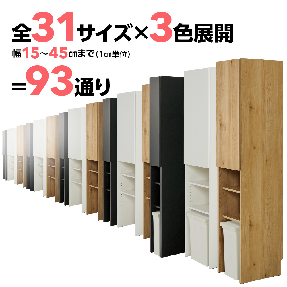 ゴミ箱の上が幅ぴったりの収納庫に幅15cmから45cmまで、1cm単位で選べる全31サイズ。ご自宅のどんな隙間にも、まるでオーダーしたようにぴったり設置できます!