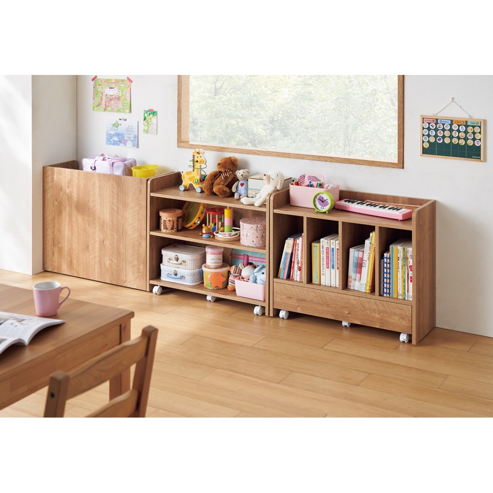 カウンター下以外にも散らかりがちな子供のおもちゃの収納や、リビング収納としても活躍します。天板もゆったりしているので、子供部屋やリビングでランドセルラックとしての使用もおすすめ。上部の角は丸みのある仕上げでお子様のいる家庭でも安心して使用できます。