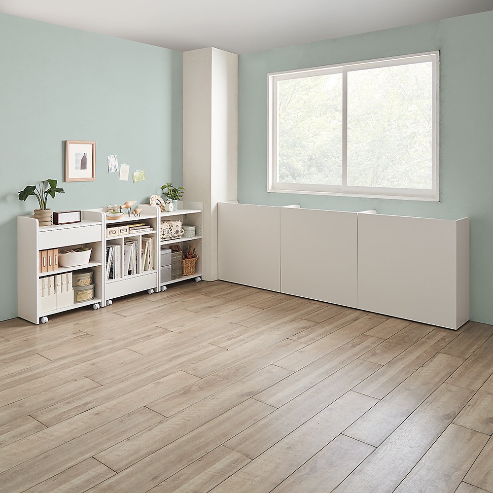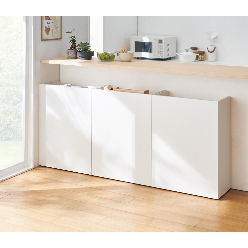 コーディネート例(ア)ホワイト ※写真は左から棚タイプ・幅59高さ80cm、小引き出しタイプ・幅59高さ80cm、マルチタイプ・幅59高さ80cmです。