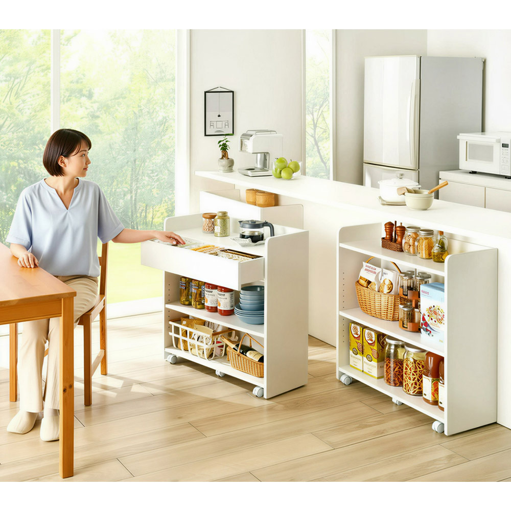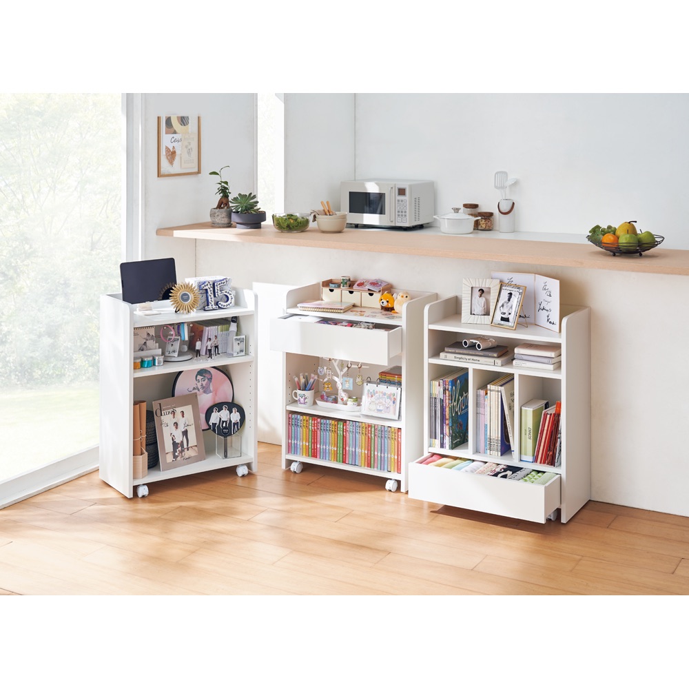 コーディネート例(ア)ホワイト カウンター下にフィットする高さ80cm。ワゴンのように動かせるので、ティータイムのお供に。 ※写真は右から棚タイプ・幅79高さ80cm、小引き出しタイプ・幅79高さ80cm、マルチタイプ・幅79高さ80cmです。
