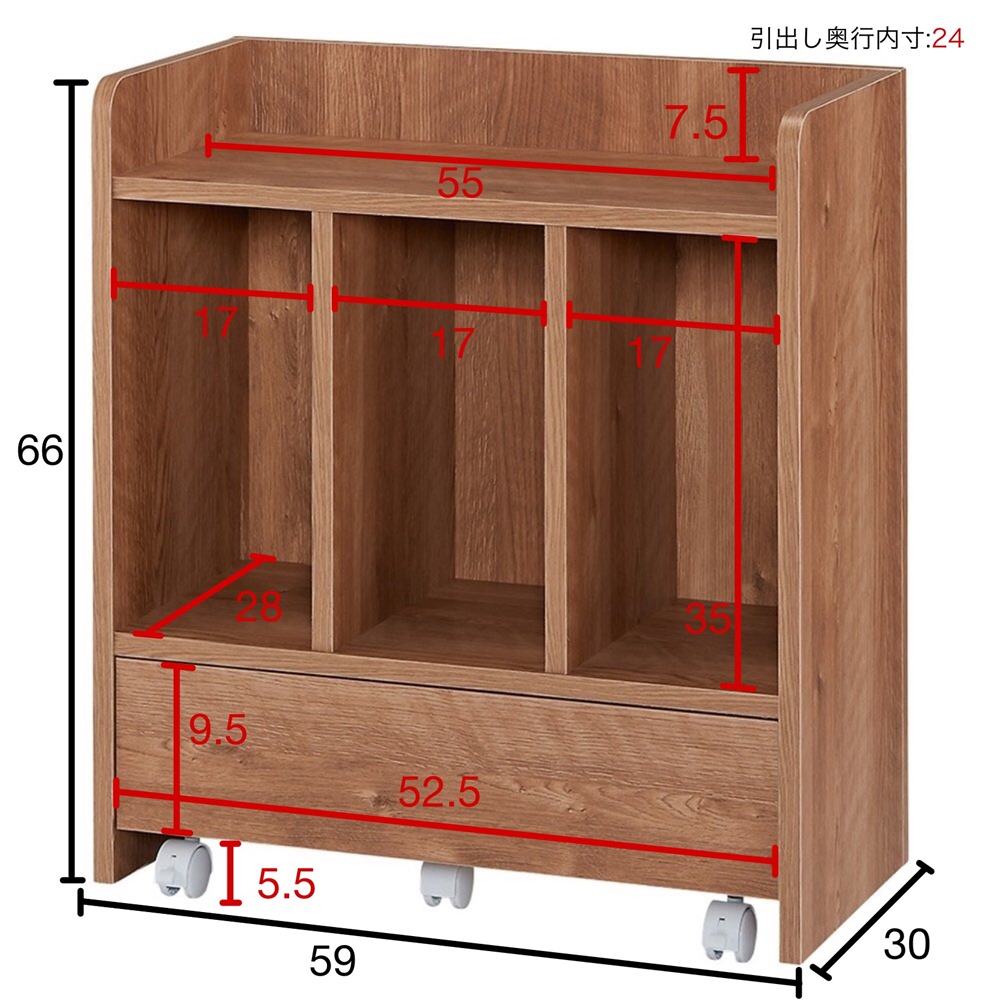 マルチタイプ幅59cmの引出し内寸は、幅52.5高さ9.5奥行24cmです。マルチタイプはワゴン下部に引出しがあります。商品画像の説明。