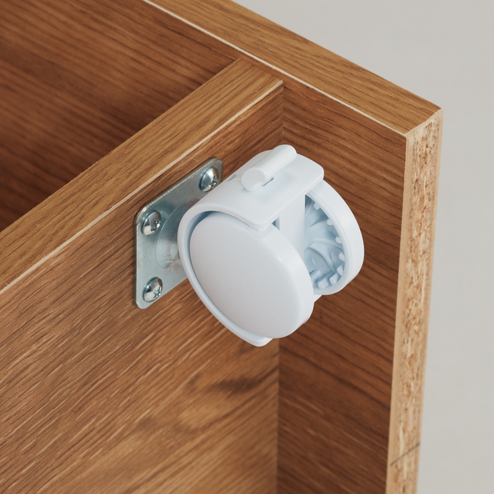 背面まできれいな化粧仕上げの隠しキャスター付きの収納庫。ワゴン感覚で簡単に移動することができます。