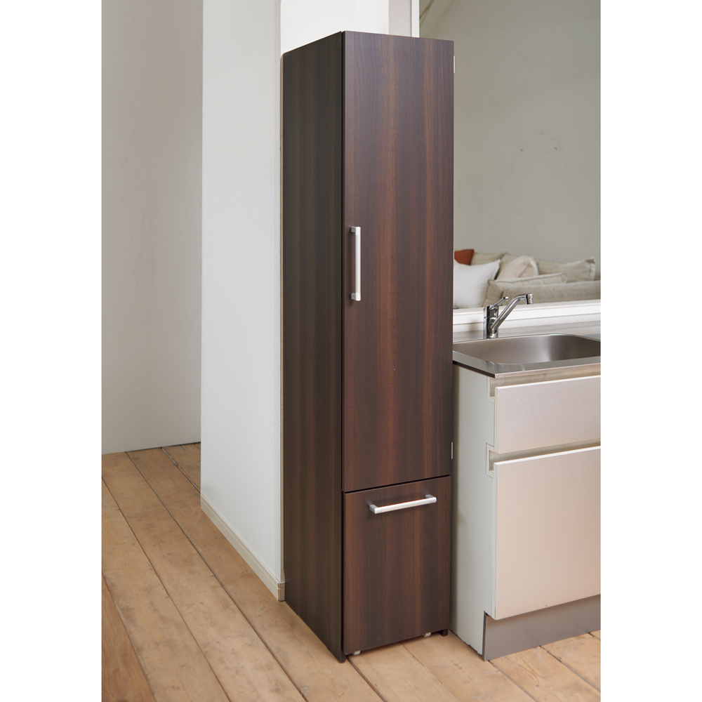 使用例:ダークブラウン 5分別 幅36.5 奥行45 高さ180.5cm(お届け商品)すき間収納にぴったり!スリムなタワー型分別ゴミ箱キッチンのすき間に設置できる、分別しやすいタワー型のゴミ箱です。縦に設置されたペール(ゴミ箱)で、省スペースでゴミの分別ができます。圧迫感を持たせないハイタイプのすき間家具。転倒防止バンド付きで安心感があります。扉は左開き、右開きどちらにも取り付け可能!