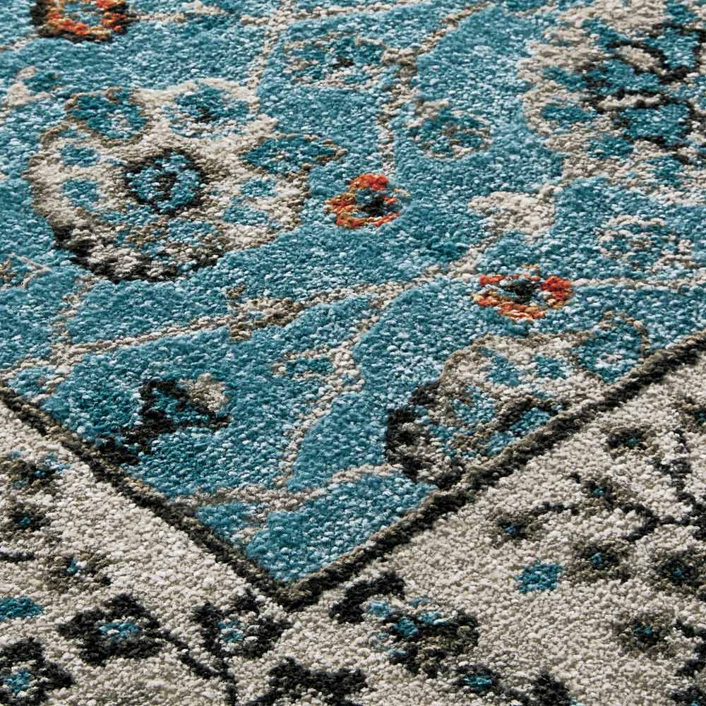 伝統的なオリエンタル柄と爽やかなブルー×アイボリーの組み合わせでクラシックなスタイルから北欧インテリアまで幅広く使える1枚。内側がグレイッシュなアイボリー系と逆転したような内側がライトブルー系の2配色です。さらっと軽やかな質感で年中使いやすいラグ