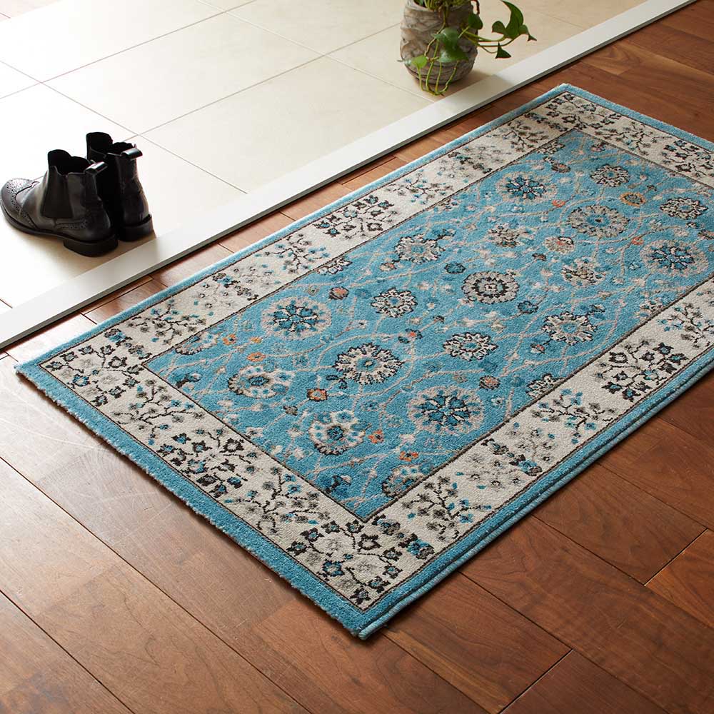伝統的なオリエンタル柄と爽やかなブルー×アイボリーの組み合わせでクラシックなスタイルから北欧インテリアまで幅広く使える1枚。内側がグレイッシュなアイボリー系と逆転したような内側がライトブルー系の2配色です。さらっと軽やかな質感で年中使いやすいラグ